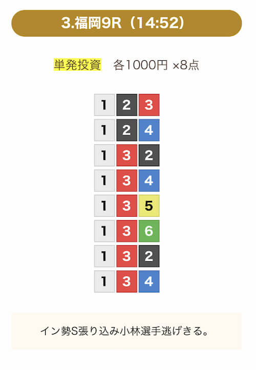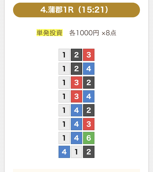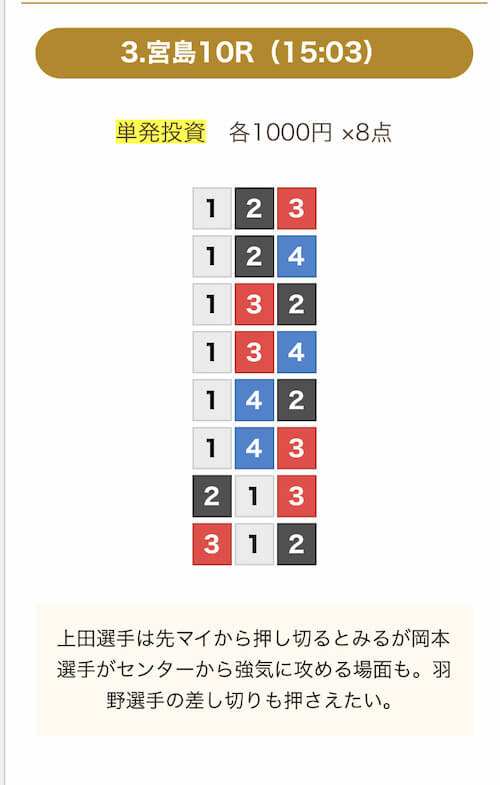 その日、公開されていた無料予想の買い目と結果はこちら。