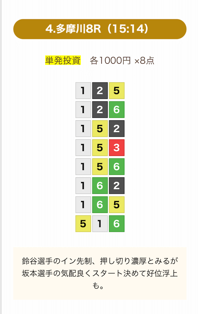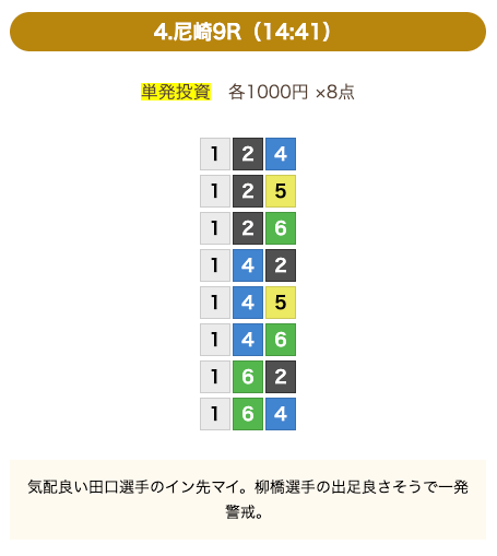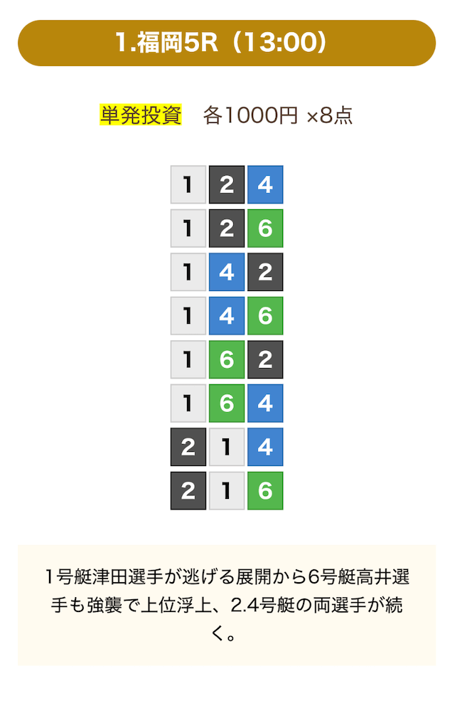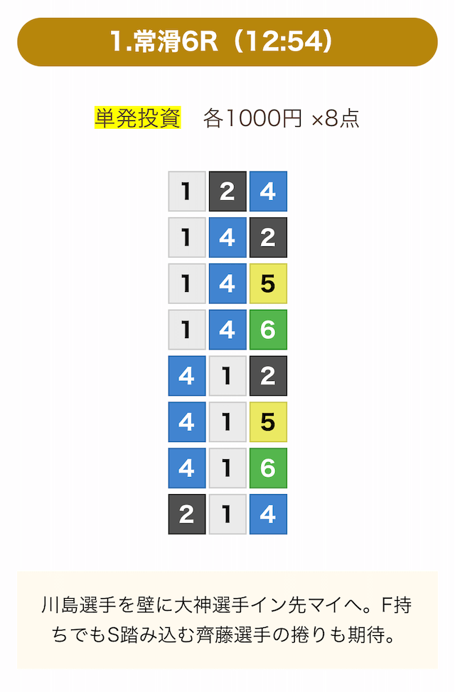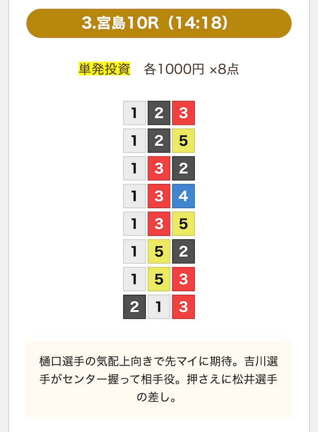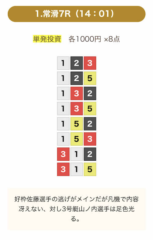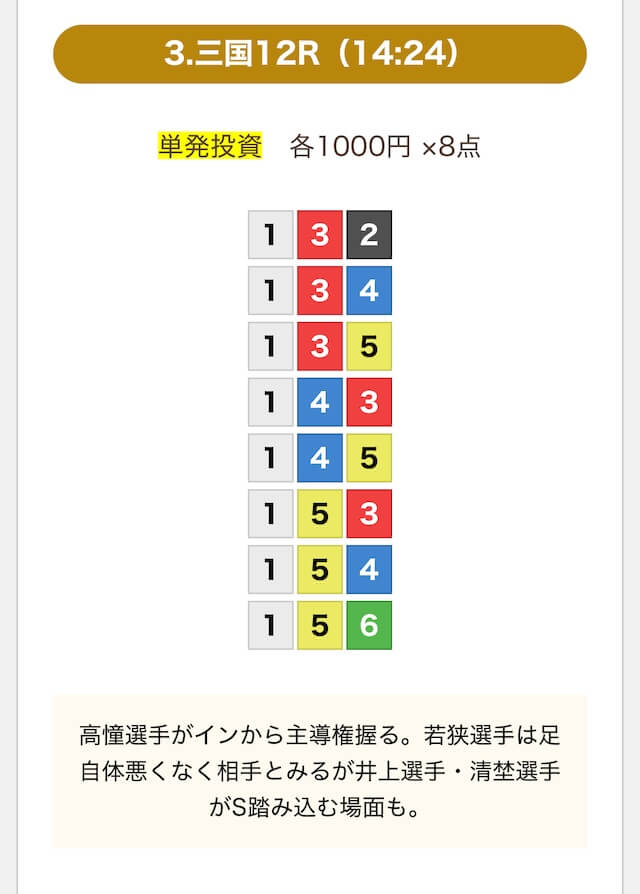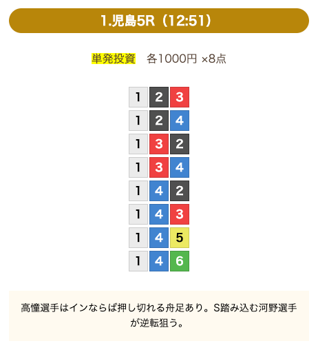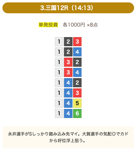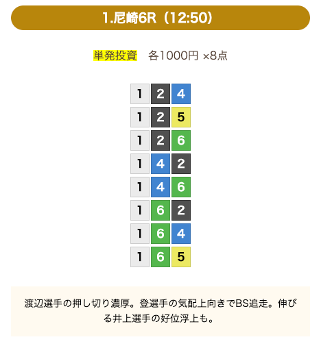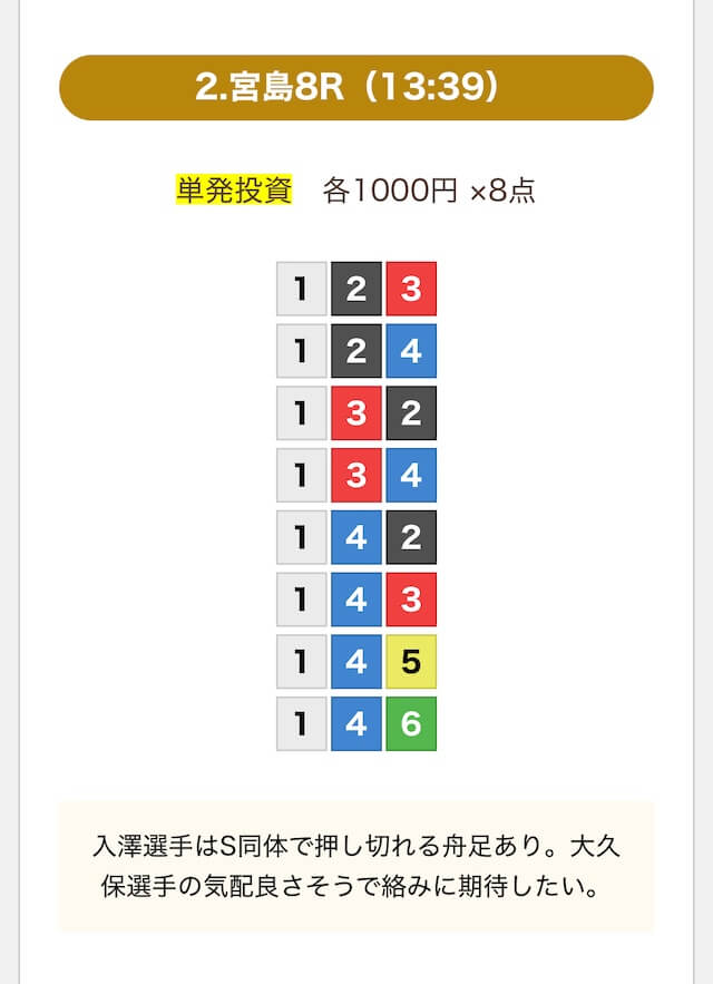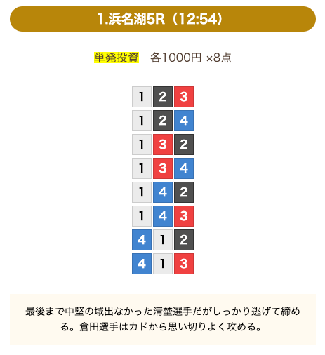 8点の買い目で結果を残し続けるってやばない?3連単って120通りだぜ!?8点の買い目だったら確率としては6%ぐらい?おれだったら絶対に無理w15点でやっと当てれるかなってぐらいww