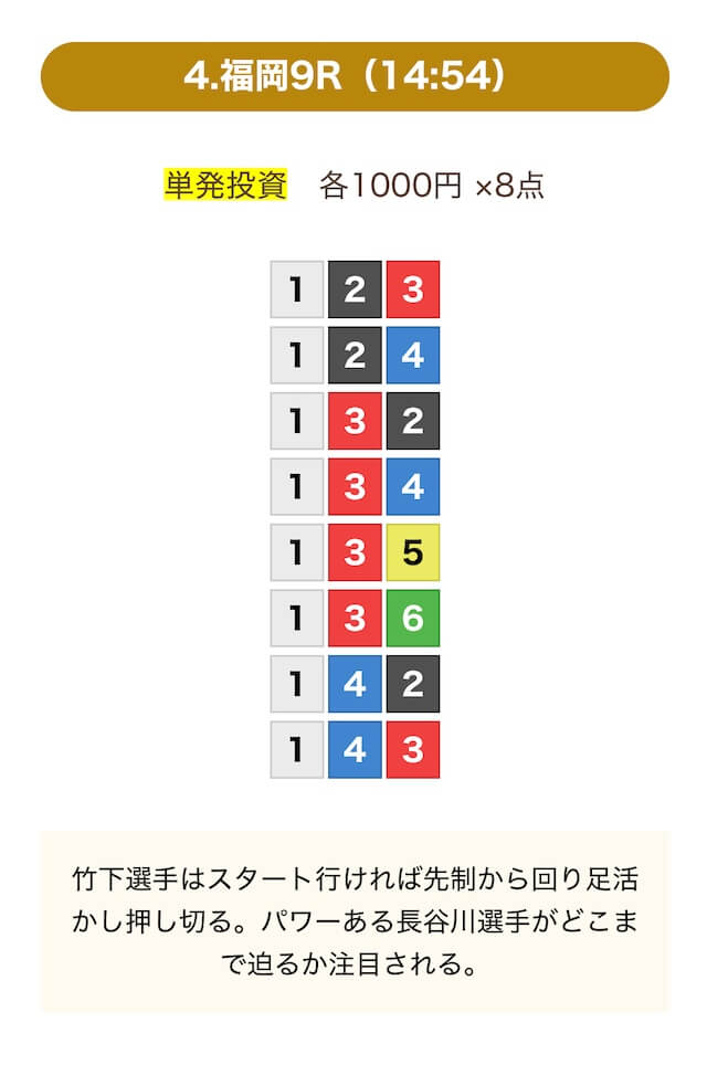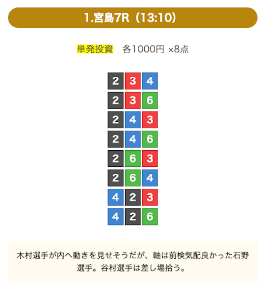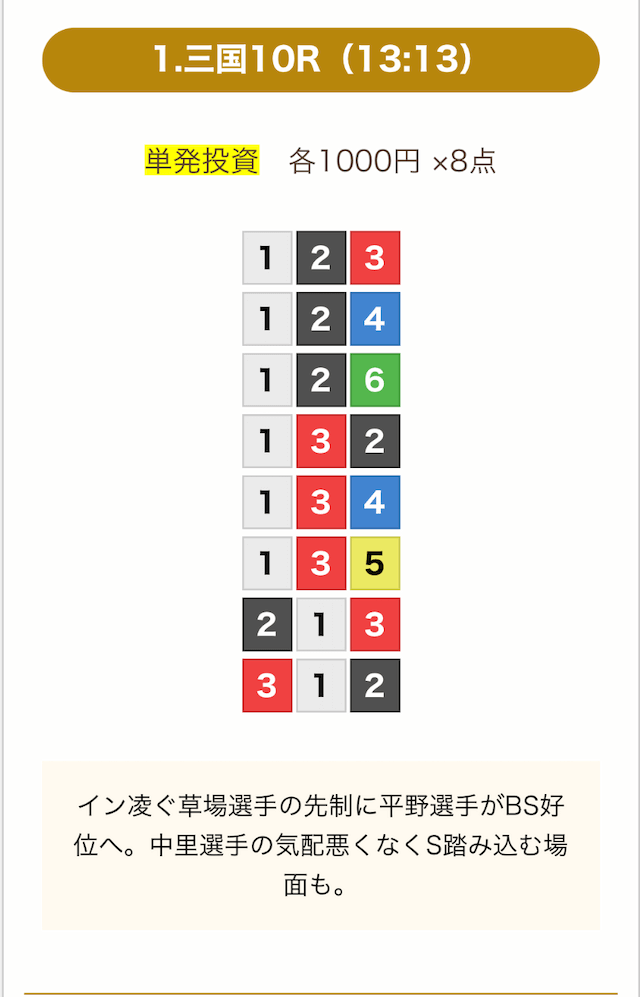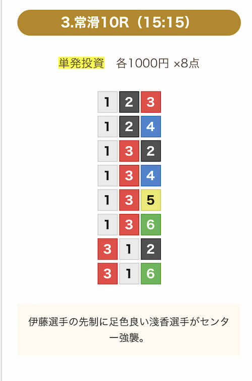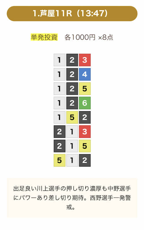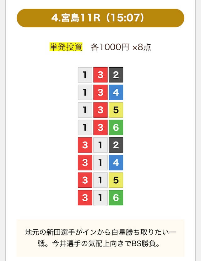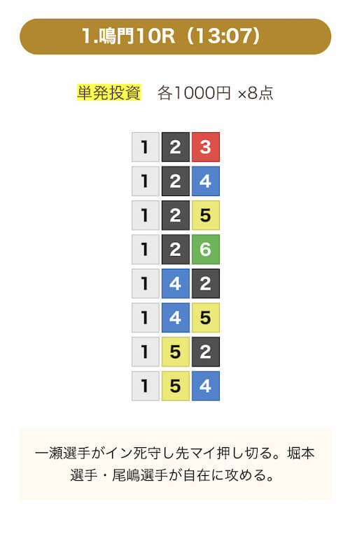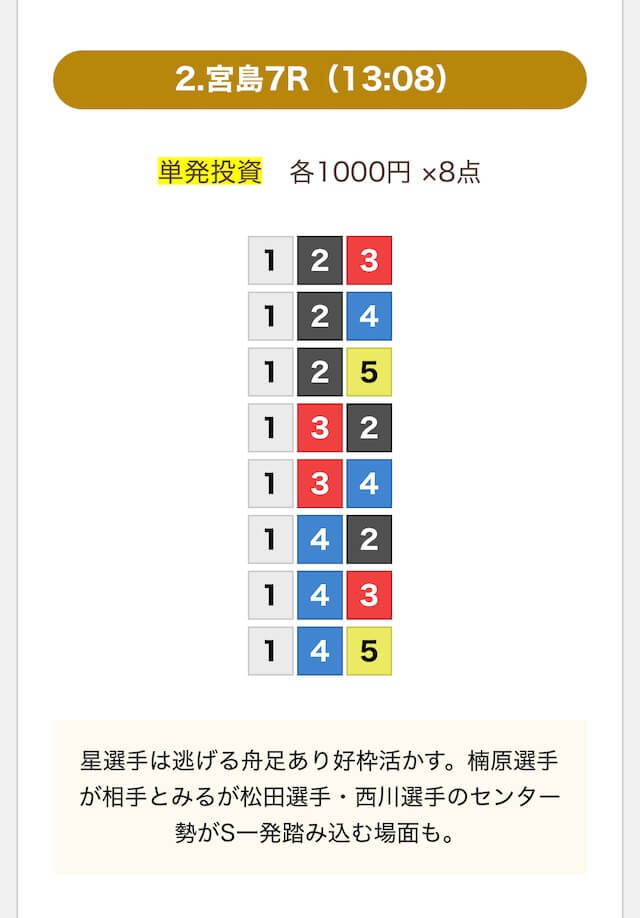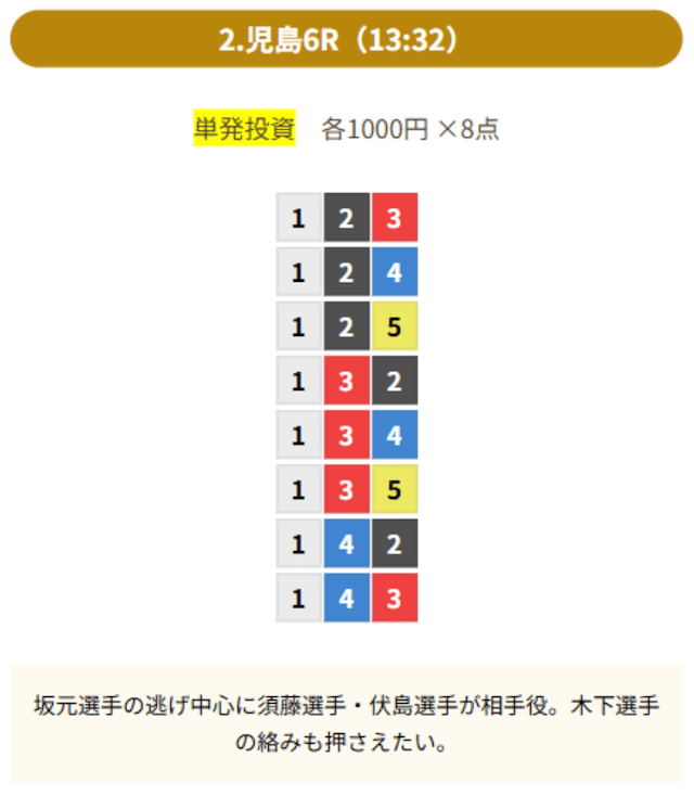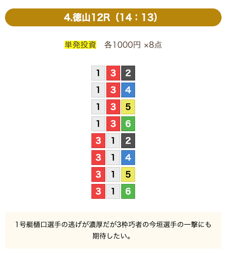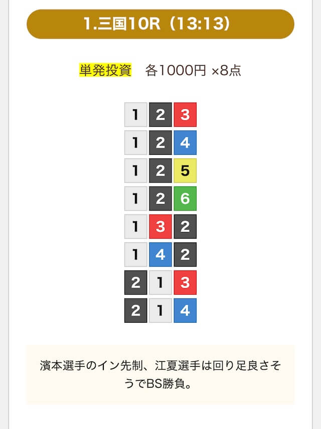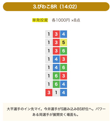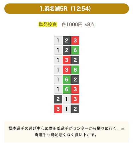 8点の買い目で結果を残し続けるってやばない?3連単って120通りだぜ!?8点の買い目だったら確率としては6%ぐらい?おれだったら絶対に無理w15点でやっと当てれるかなってぐらいww