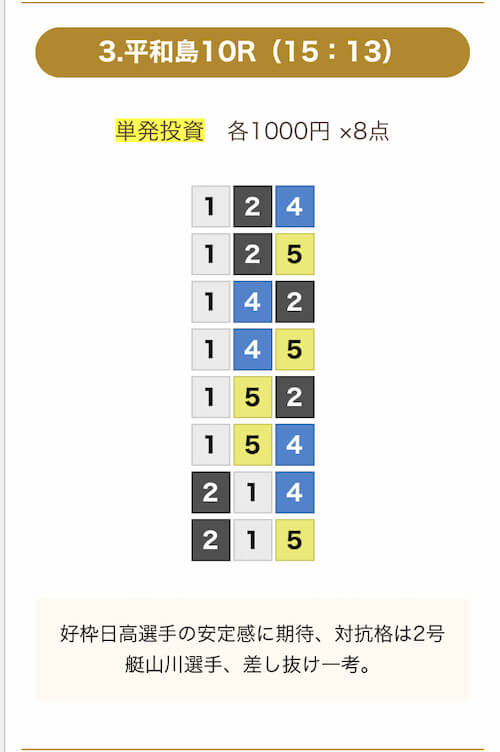 守備範囲が拾い印象。っていうのも、堅めなレースもしっかり配当を狙えるレースもバランスよく狙ってて、どれも勝率が高い。どれかひとつに特化しているサイトはあるけど、ここまで万能な競艇予想サイトは見たこと無い!