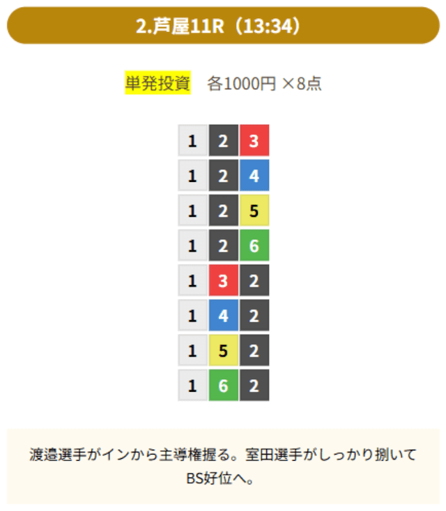 2023年11月21日の常滑10Rにて無料予想で28,400円という的中実績が掲載されていました。