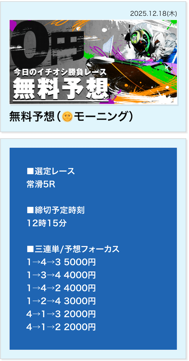 ★★★★★ 5.02025/04/22私は自分で体験したことしか信用できないので、無料予想を参加せずに買い目だけ見てました。