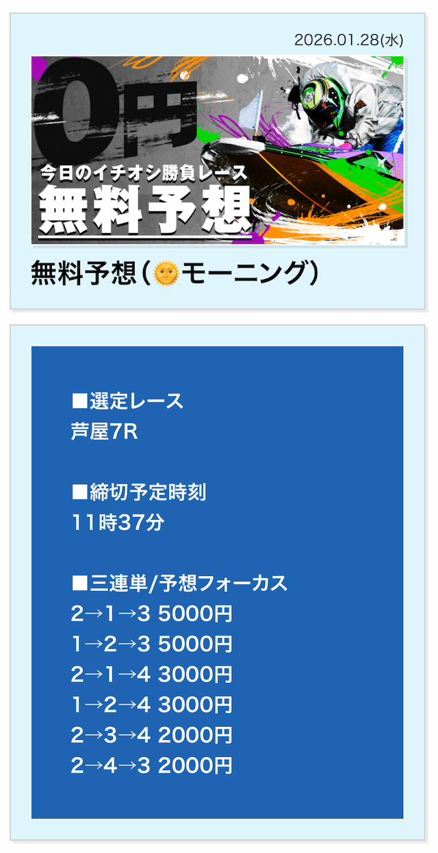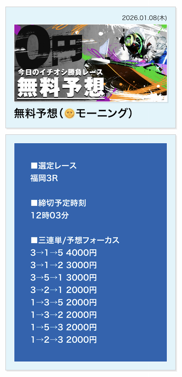 私は自分で体験したことしか信用できないので、無料予想を参加せずに買い目だけ見てました。