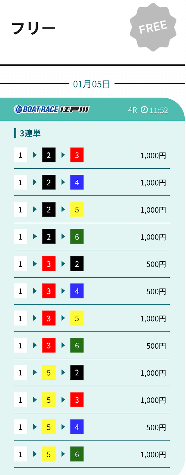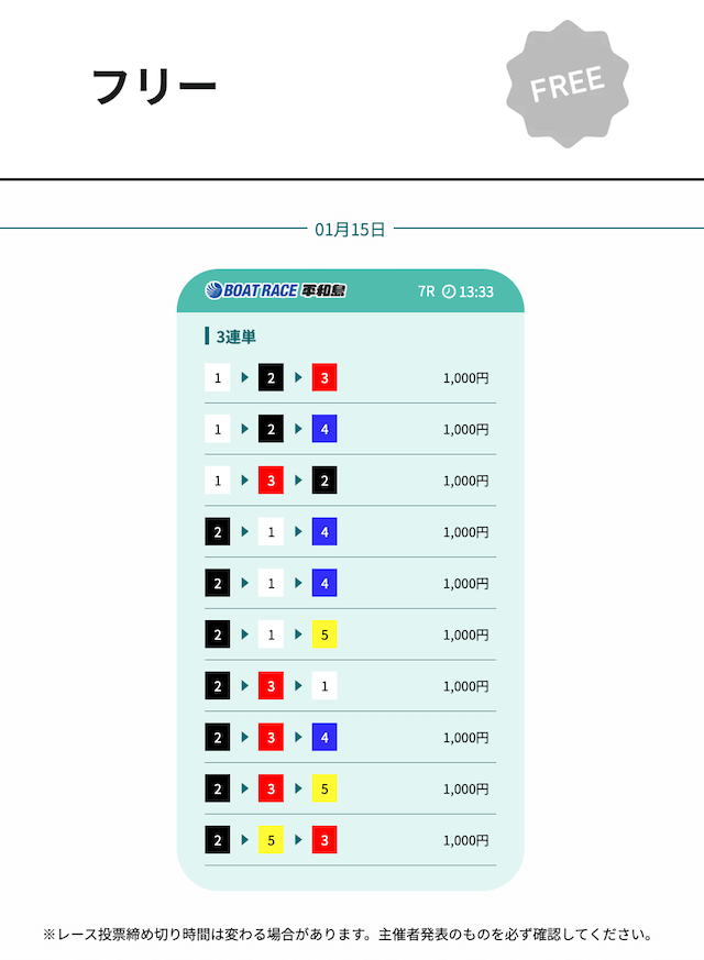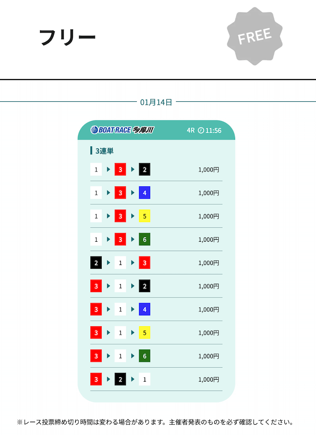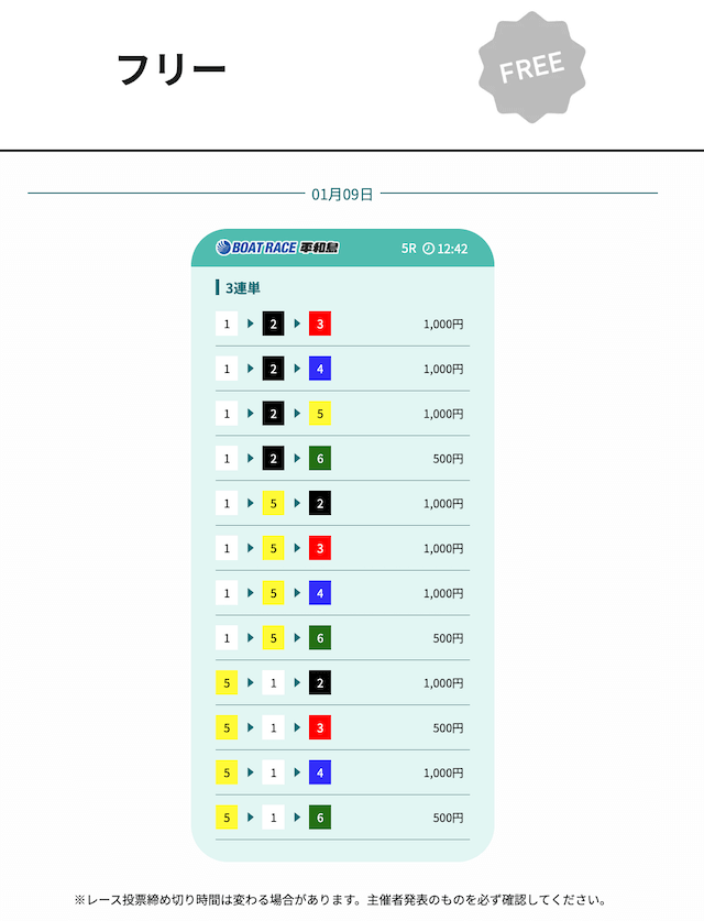 実際に、締切時間(12:30)前の無料予想がいくつか確認できましたが⋯