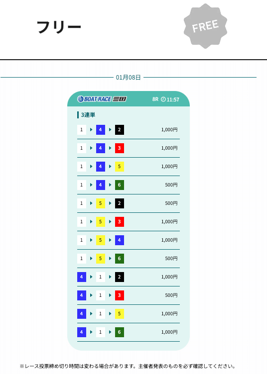 ★★☆☆☆ 2.02025/12/11公開時間から1時間後のレースとかだから、締切時間ギリギリで無料予想参加しようとすると、終わってることがあるかな。