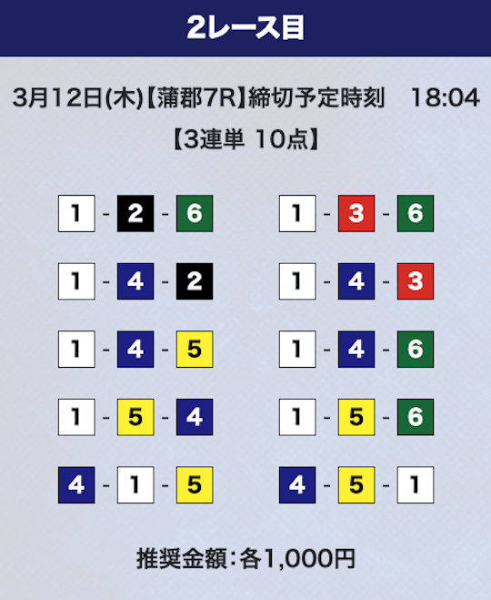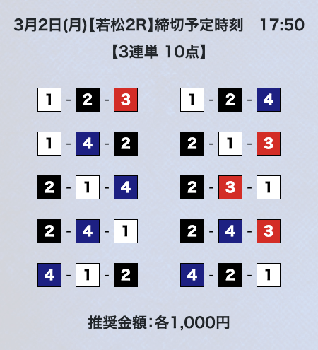 - Q3推奨投資金じゃなくても稼げますか?Aボートブレイズの予想は妙味ある狙い方をしているので、軍資金が少ない方でも稼ぎやすいでしょう。基本的に無料・有料ともに均一の舟券代になっているので、自分の軍資金に合わせて均等分配で勝負してみてください。
