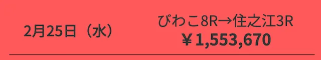 | 150万超え戦略 | びわこ8R→住之江3R ¥1,553,670 |