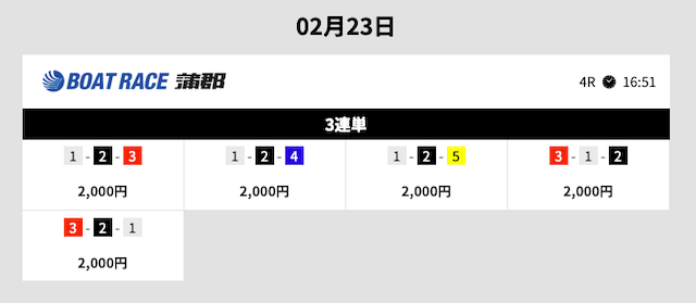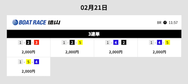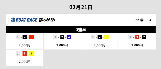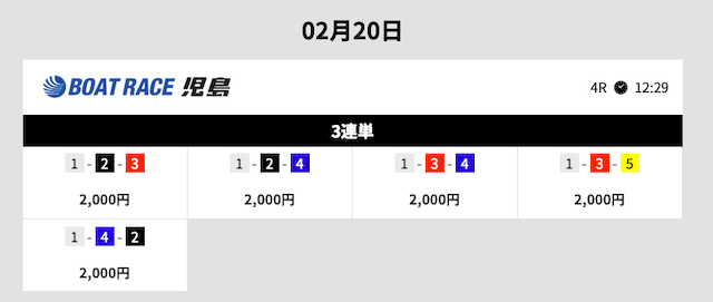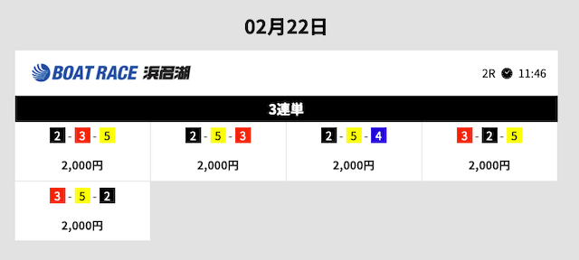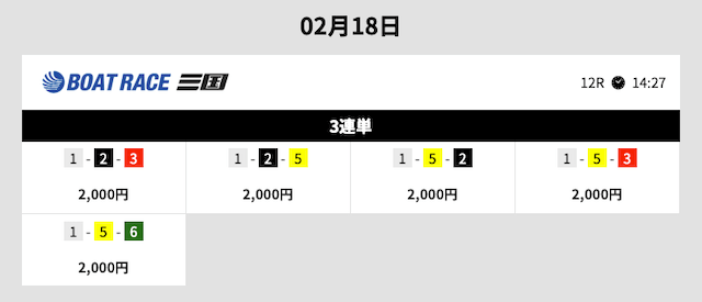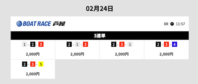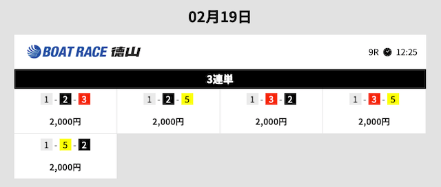 3連単フォーメーション5点の予想で、1万円の舟券代が均一分配されています。