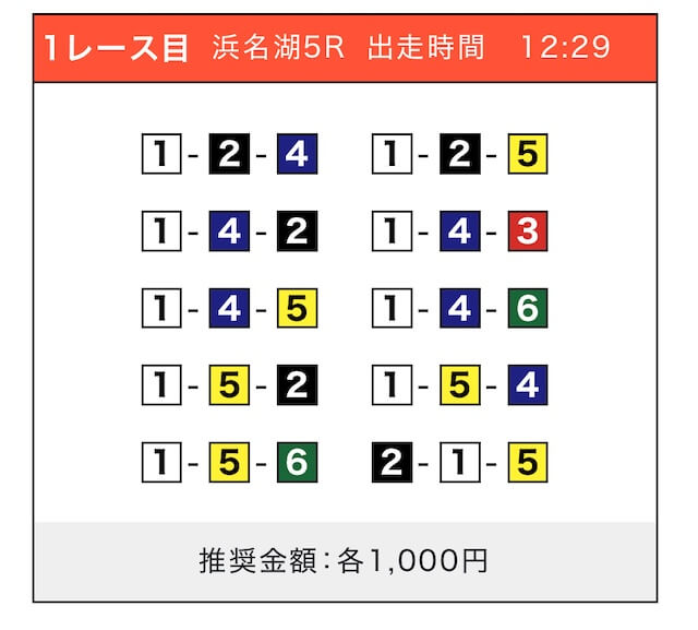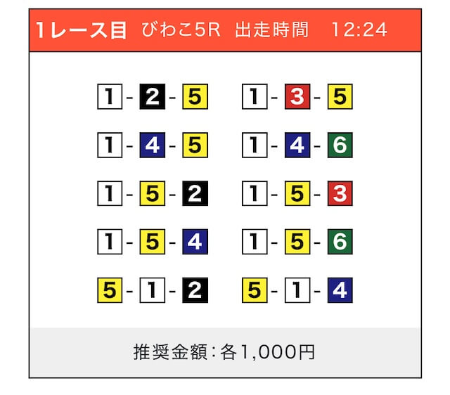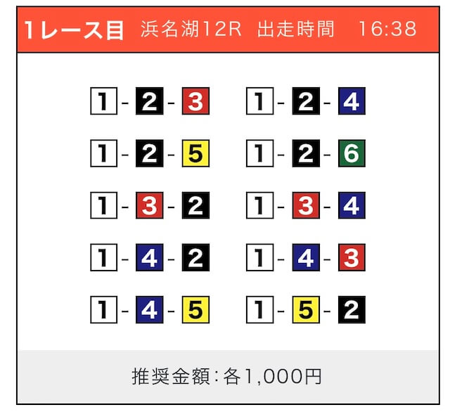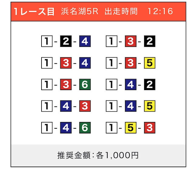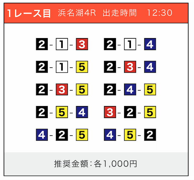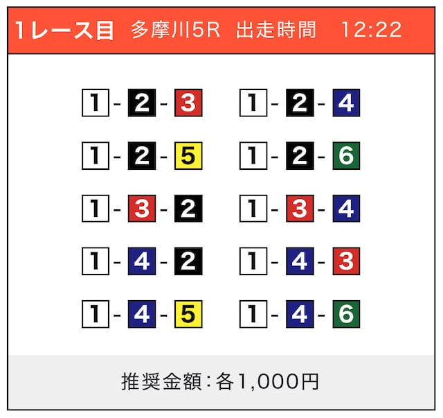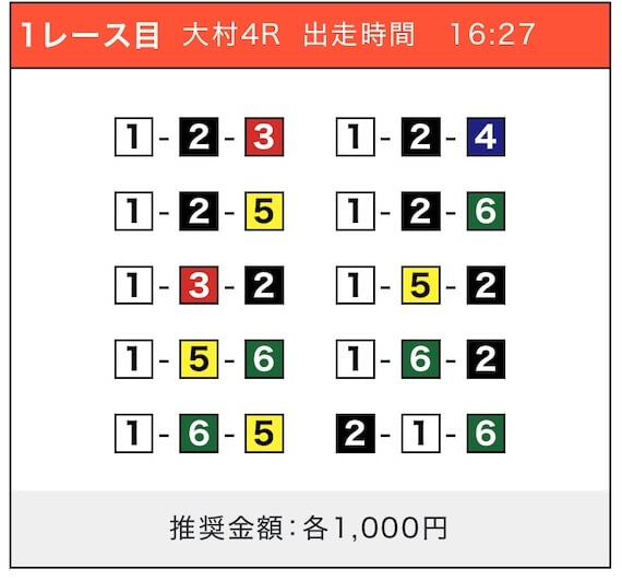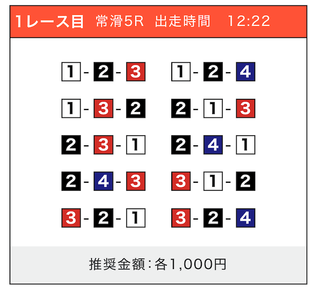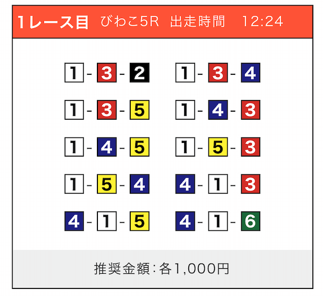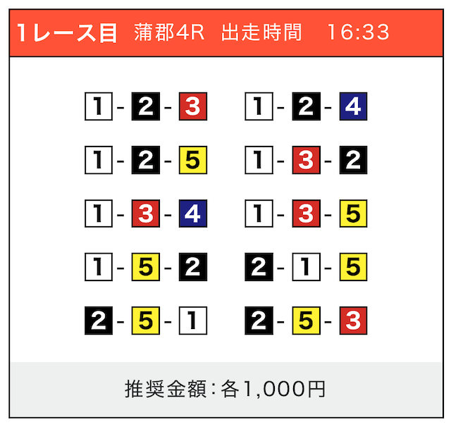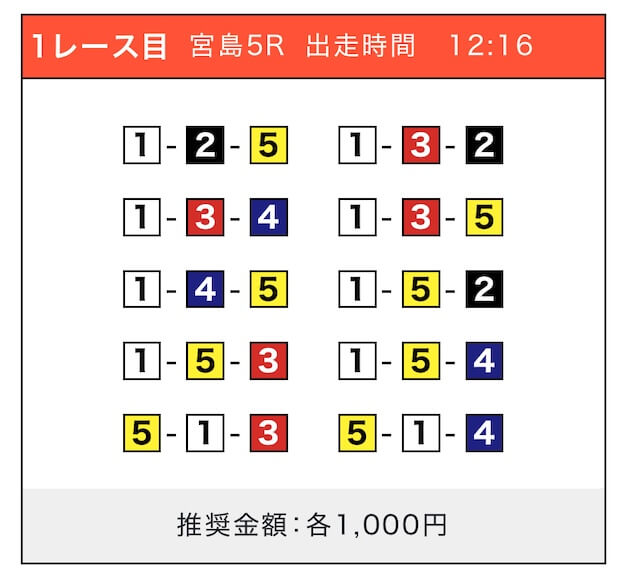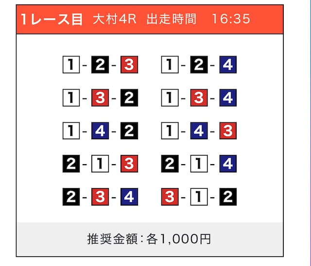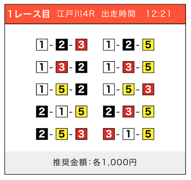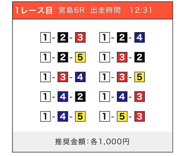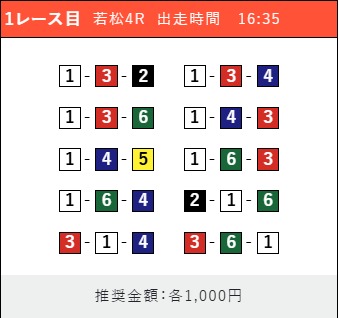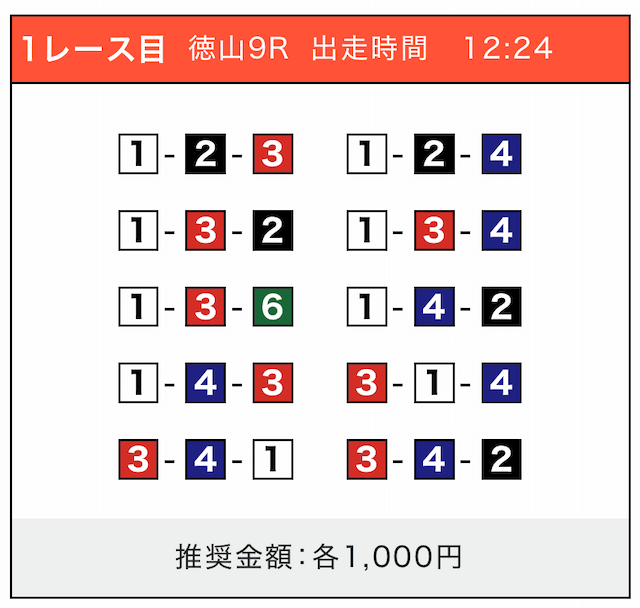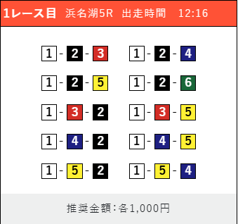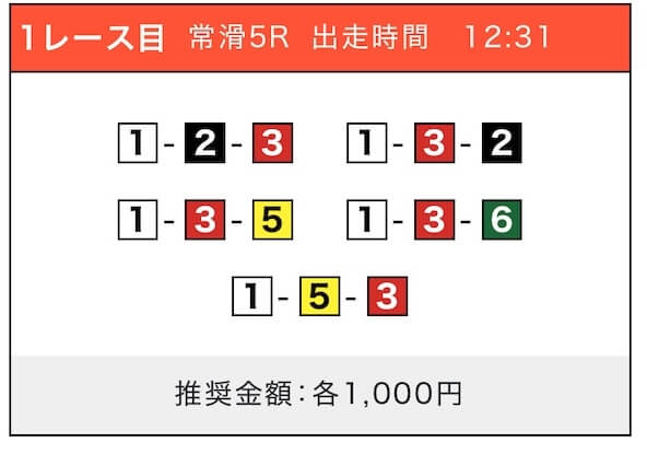 徳山5Rの結果は1-2-3だったので、公開された買い目の順番で言うと1番目の買い目で的中しています。