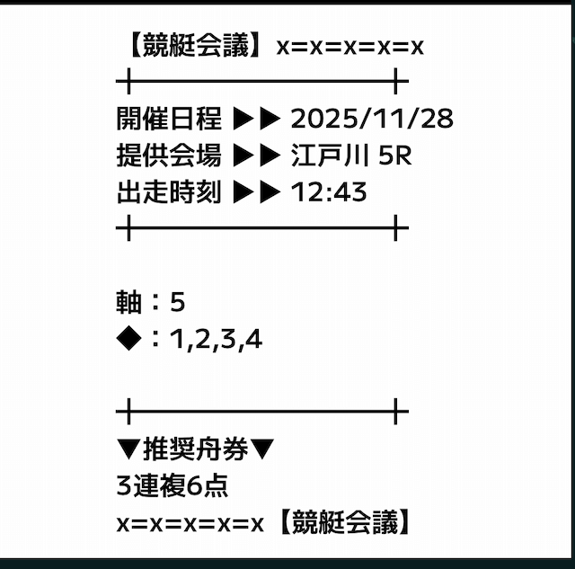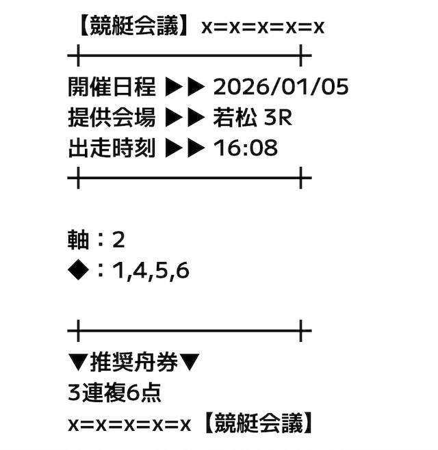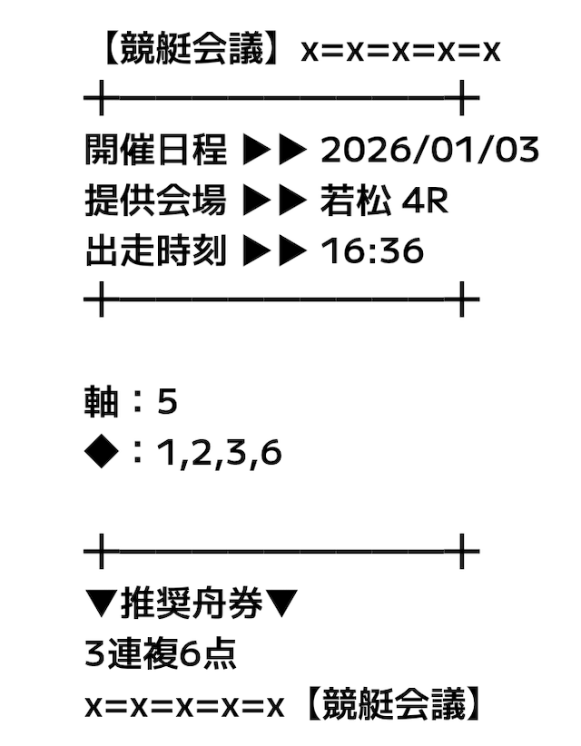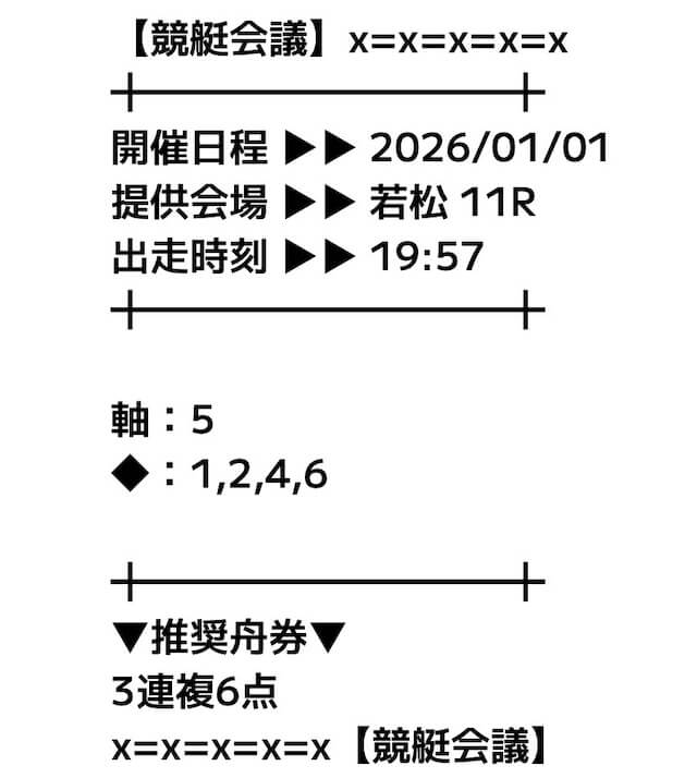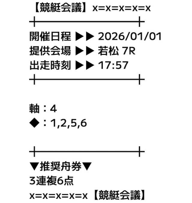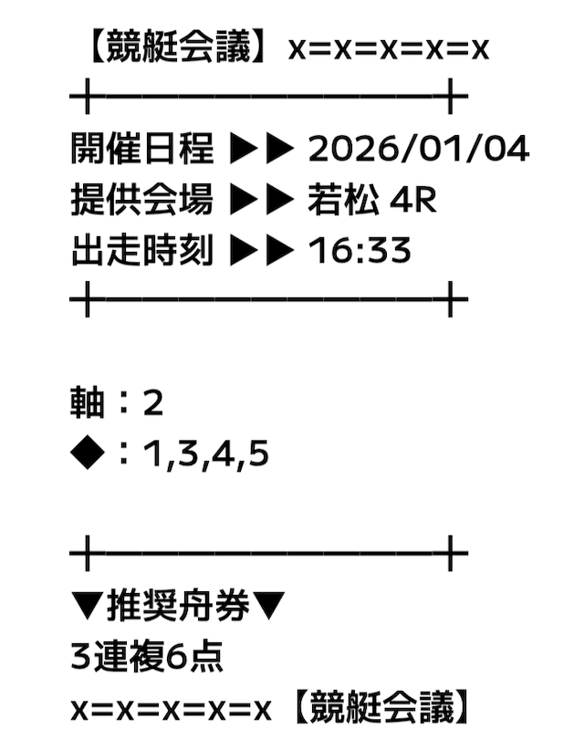 基本的には軸の1艇と相手の4艇を選択した3連複のフォーメーションで、推奨舟券代の記載はなし。