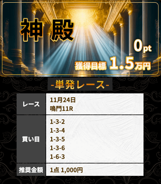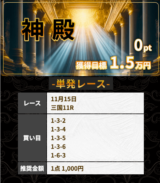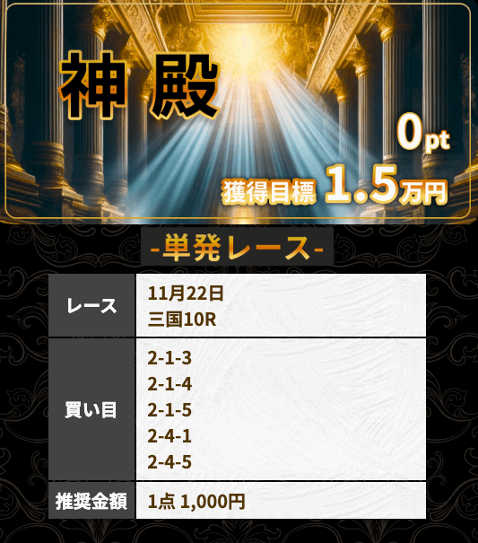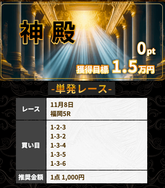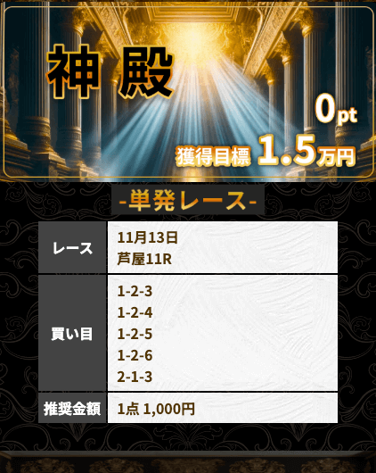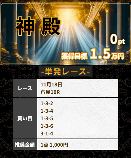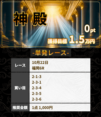 | 聖域 | 1戦1勝0敗 | 100% | 417% | 10,000円 | 13,000円 | 95,910円 | +72,910円 |