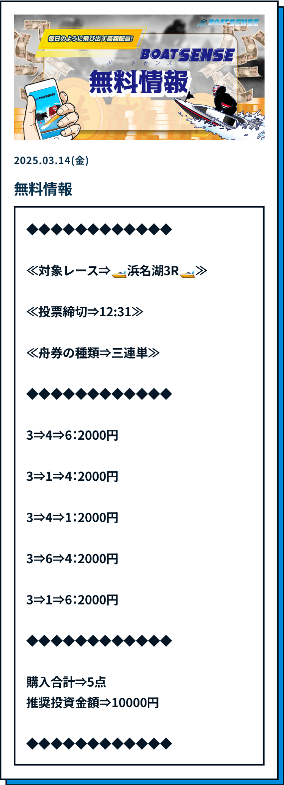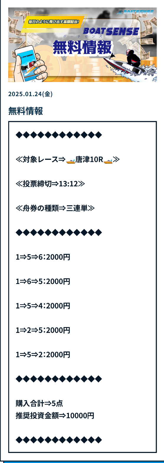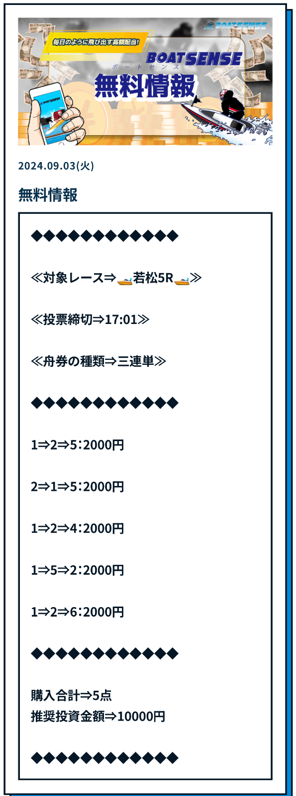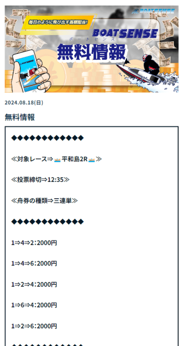 ボートセンスの無料予想は、1日2レース公開してくれてるのが本当にありがたい。自分みたいに仕事してる人がほとんどだろうから、予定を合わせやすいっていうのは大きいよね。しかもそれで稼げなかったら意味ないけど、ボートセンスなら全く持って心配ない。無料予想だけども全然利用価値あると思うよ。
