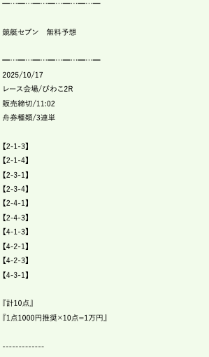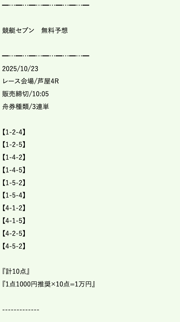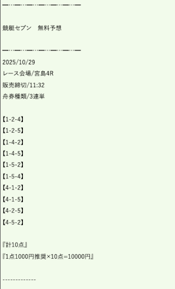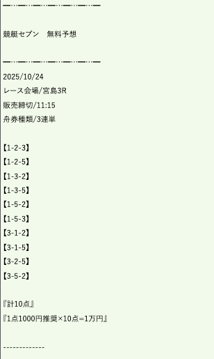 ★★★★★ 5.02025/08/29競艇予想で10点は多い気がするけど、しっかり利益出してくれるあたりレース選びがうまいんだと思う。