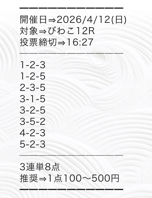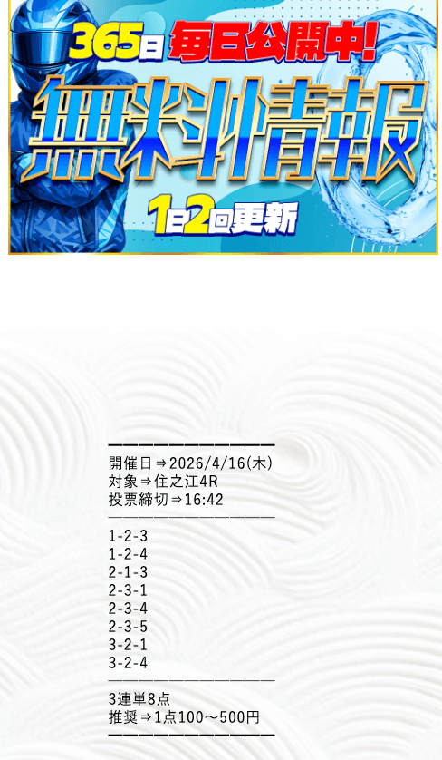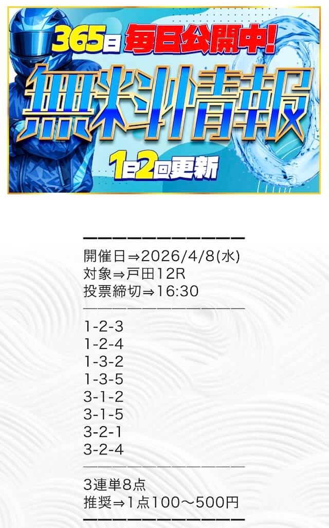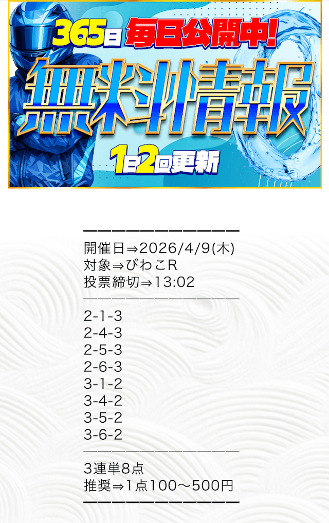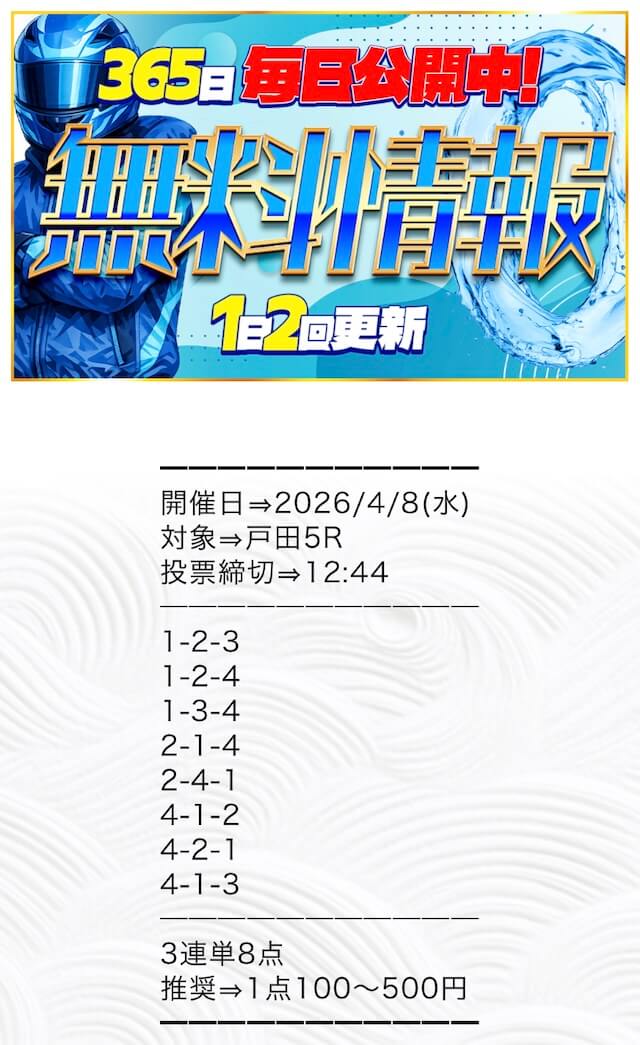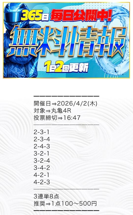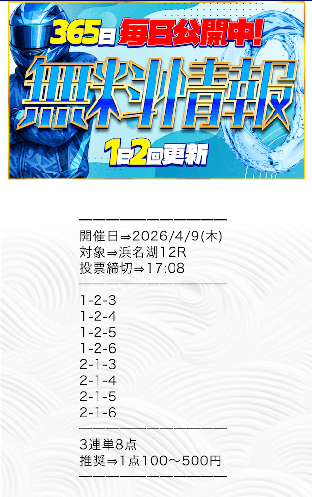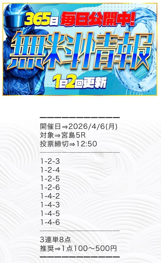 分析結果を踏まえて、契約を結んでいる年間回収率300%超えの舟券師が予想し、毎日高額払戻を実現しているそうです。