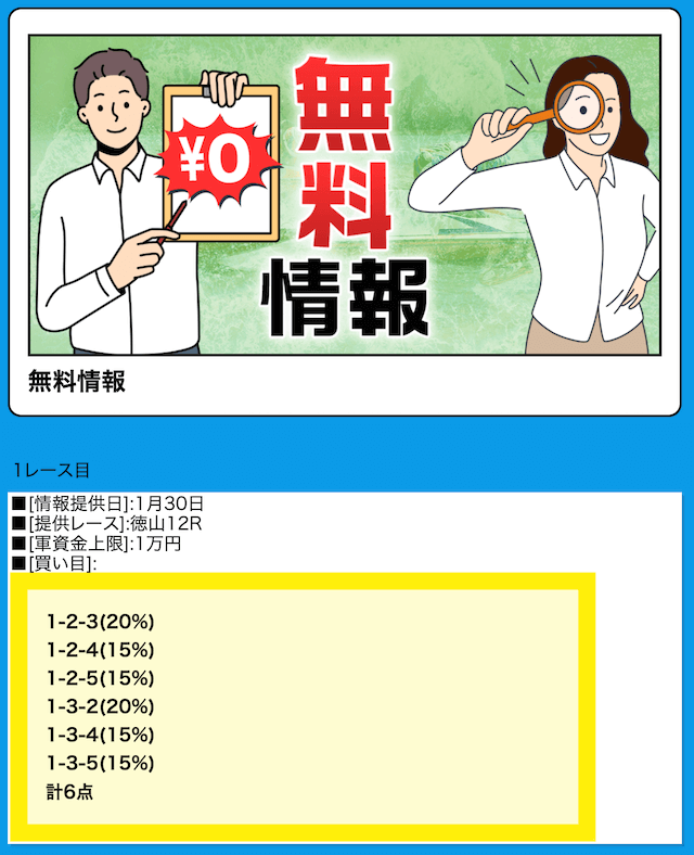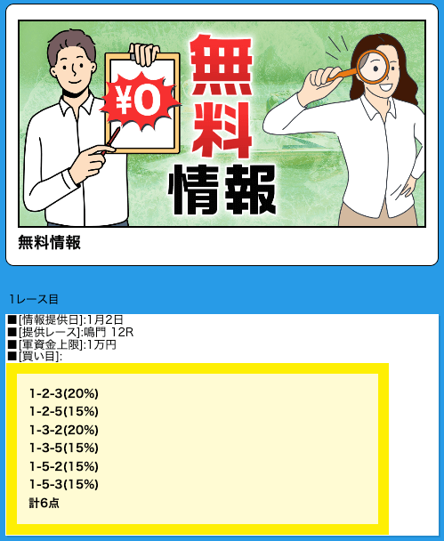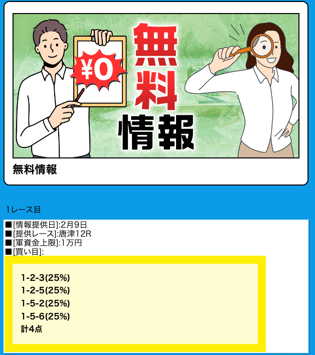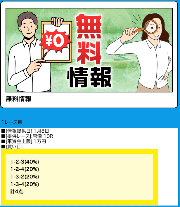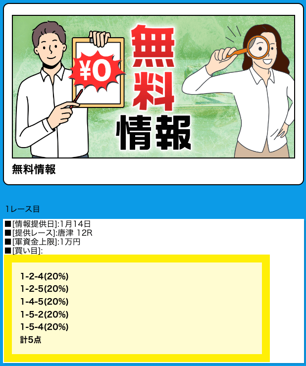 ★★★☆☆ 3.02025/01/19悪くはないけど、無料予想でもっと稼げたら嬉しいですね。
