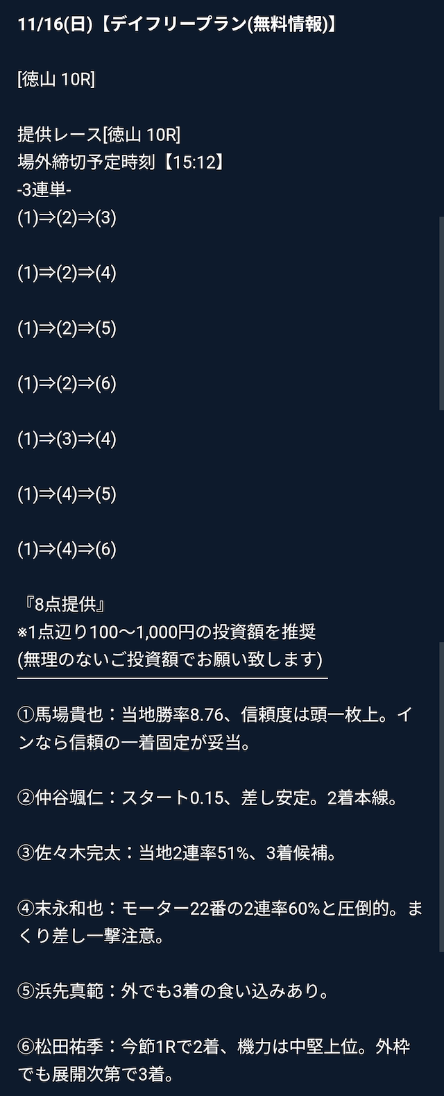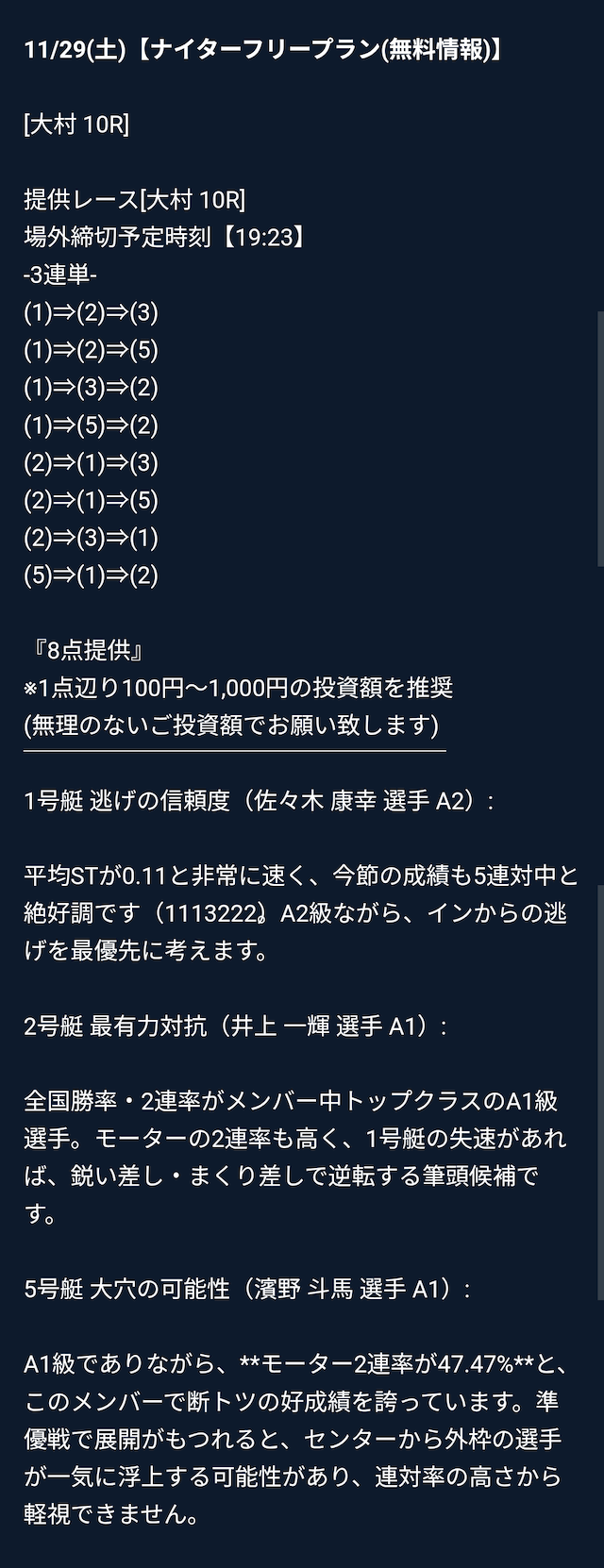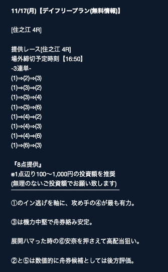 ただ、有料の一番上結構情報料が高いな、、、。一攫千金ねらえるんだとおもうけど、俺にはまだ早そう。とりあえず資金を増やすとかから始めるよ。 -