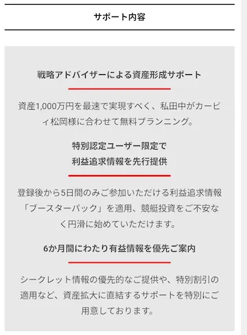 - Q4具体的なサポート内容は?A競艇ブーストが提供するサポート内容は「戦略アドバイザーによる資産形成」「特別認定ユーザー限定で利益追求情報を先に提供」「6か月間にわたり有益情報を優先にご案内」の3つです。