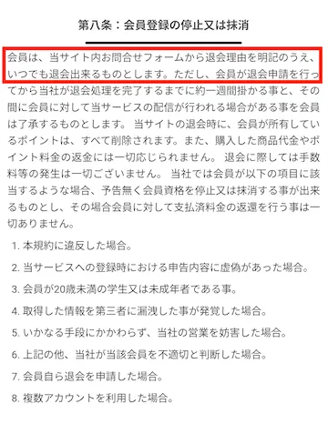 - Q5退会方法が知りたいです。A利用規約を見ると「お問い合わせから退会理由を明記」して申請することが記載されています。