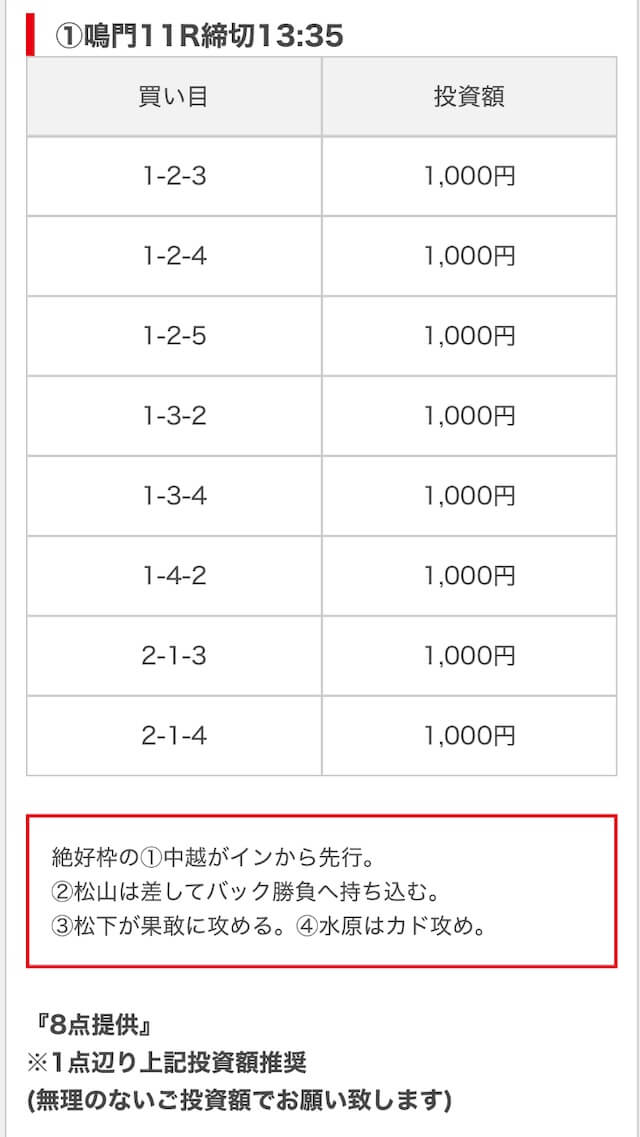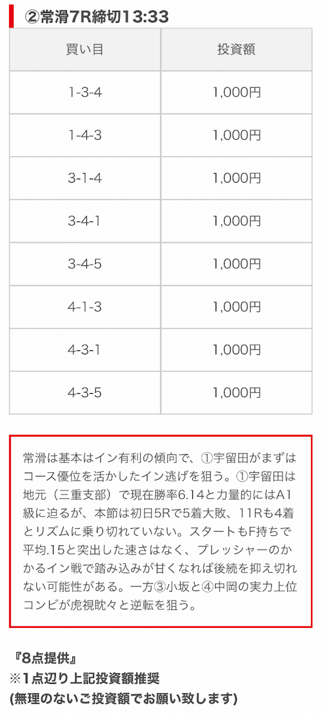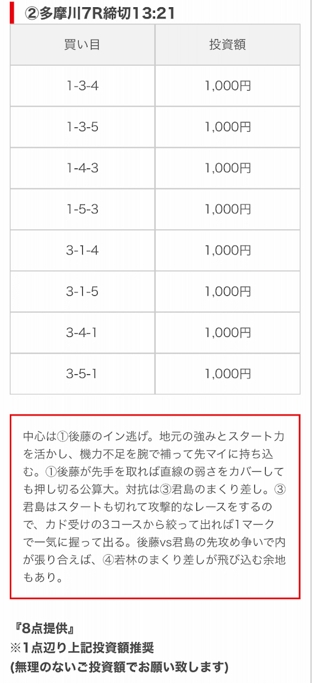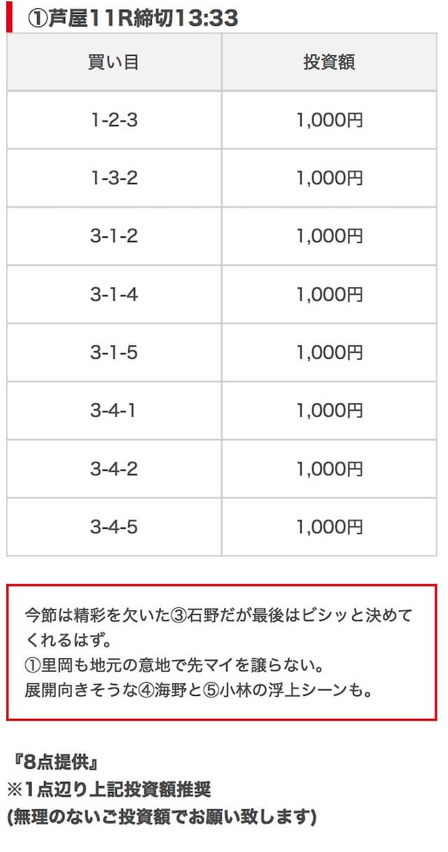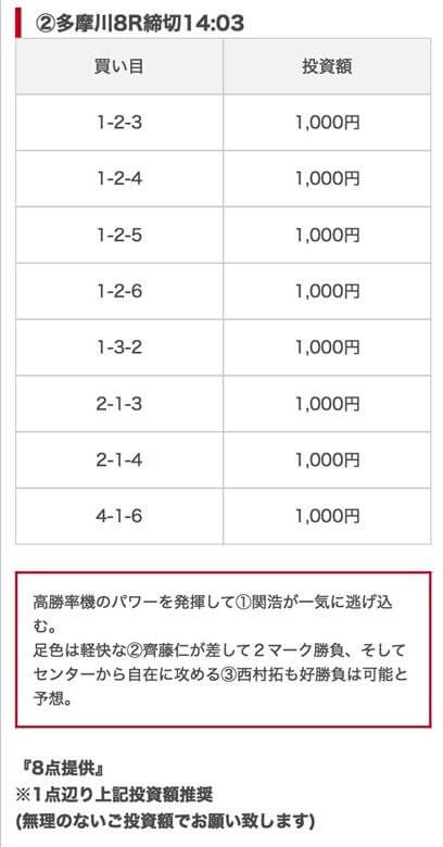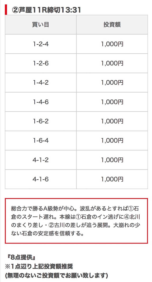 具体的には、人気決着から妙味の出る波乱決着も狙えるレース選びと、それにマッチするバランスの取れた買い目作成で効率よくユーザーを稼がせるようです。