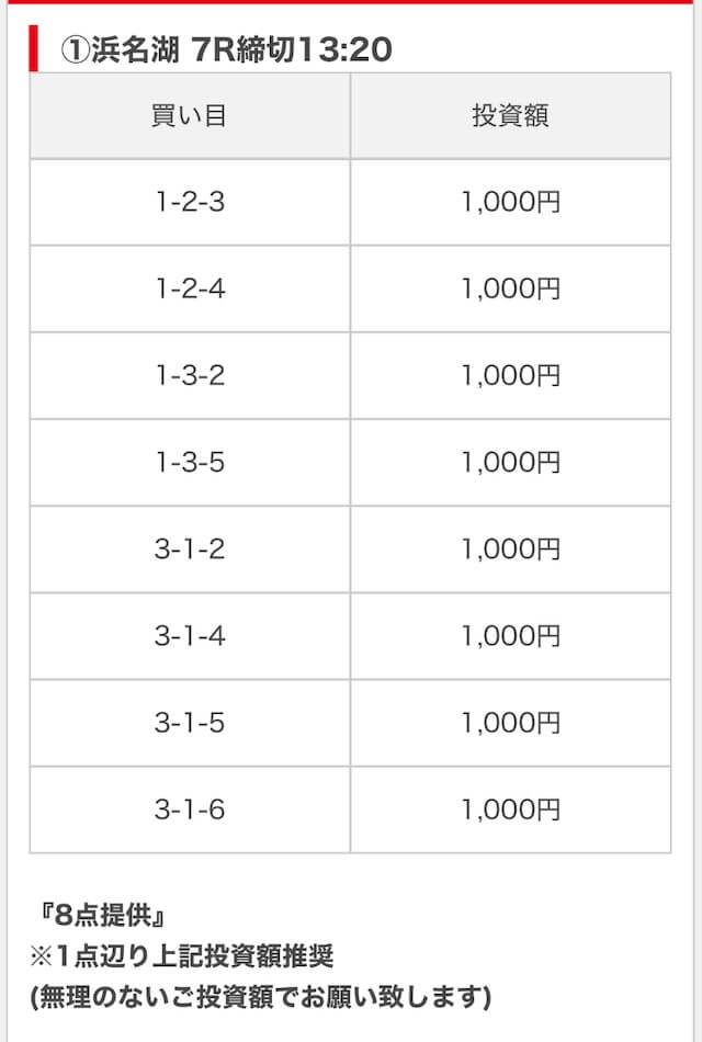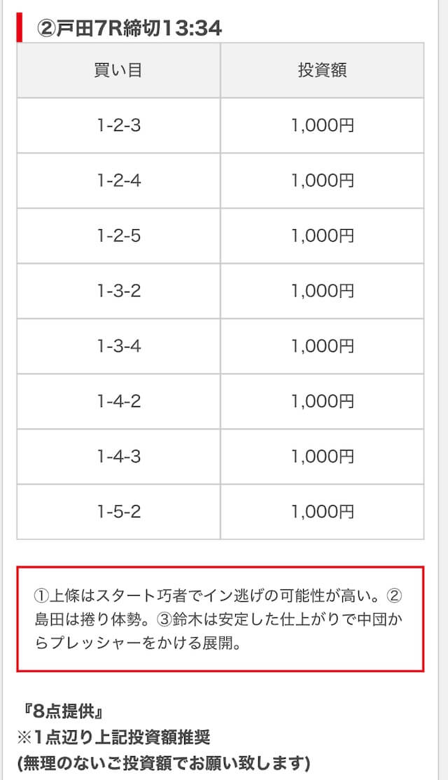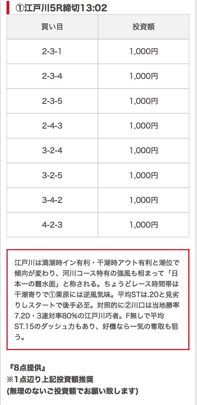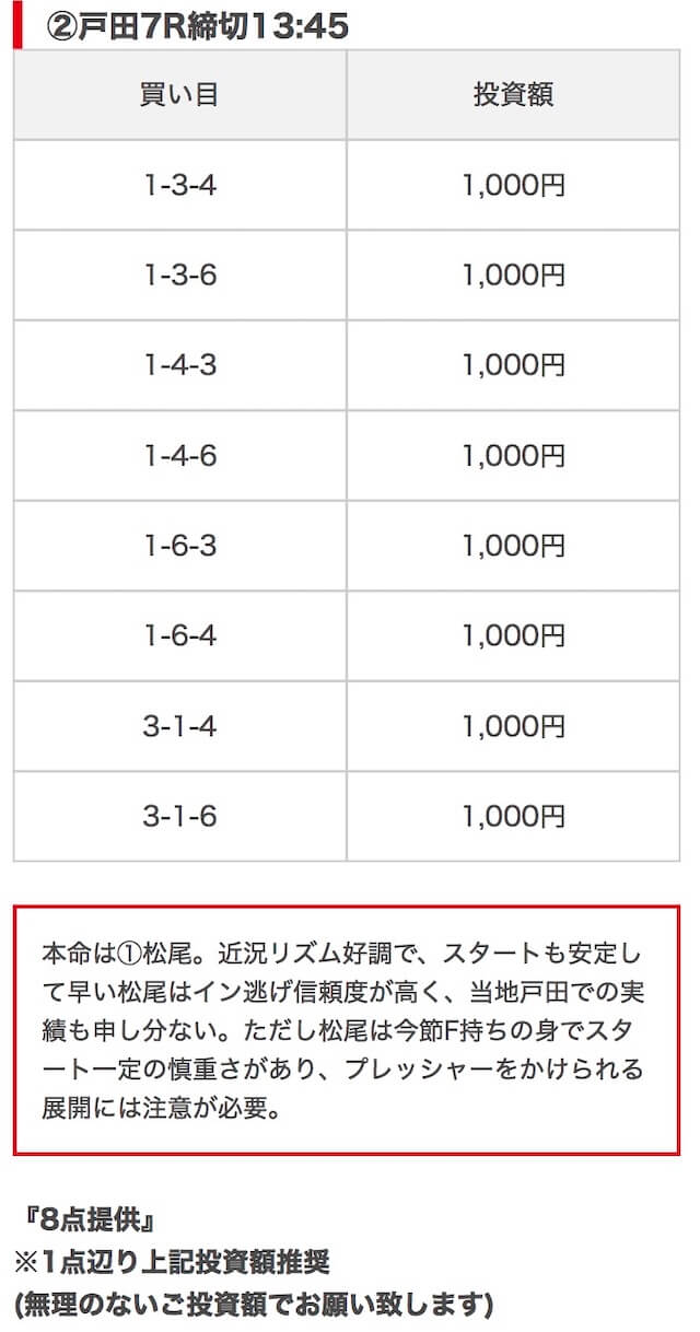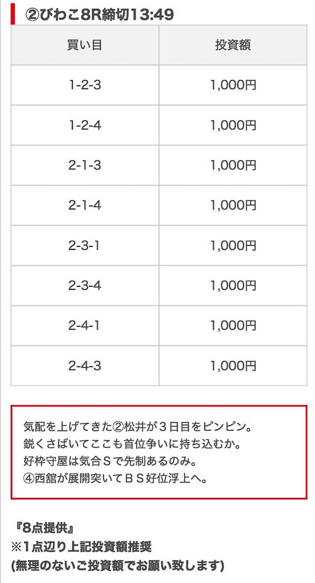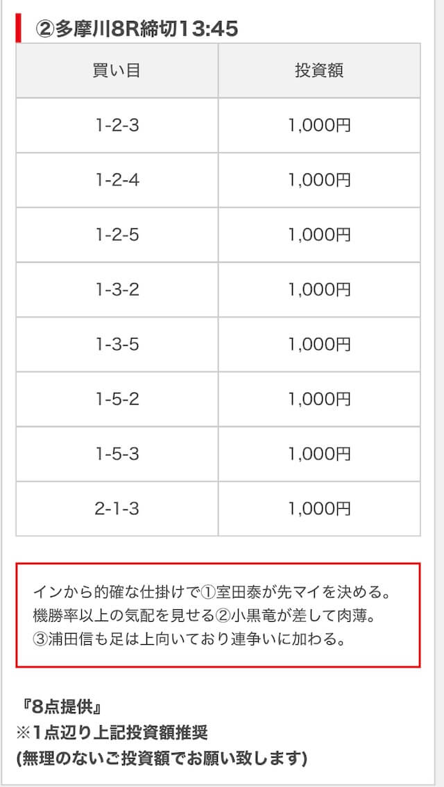 3連単フォーメーション8点の予想で、1点1,000円の舟券代となっています。