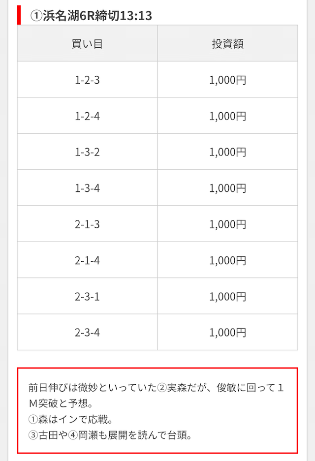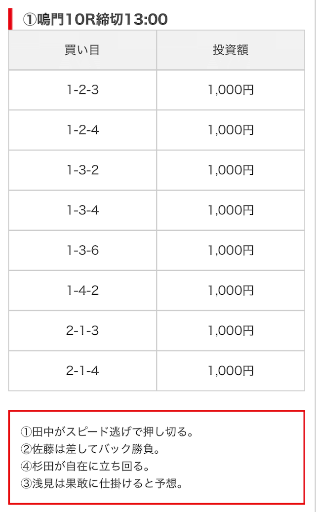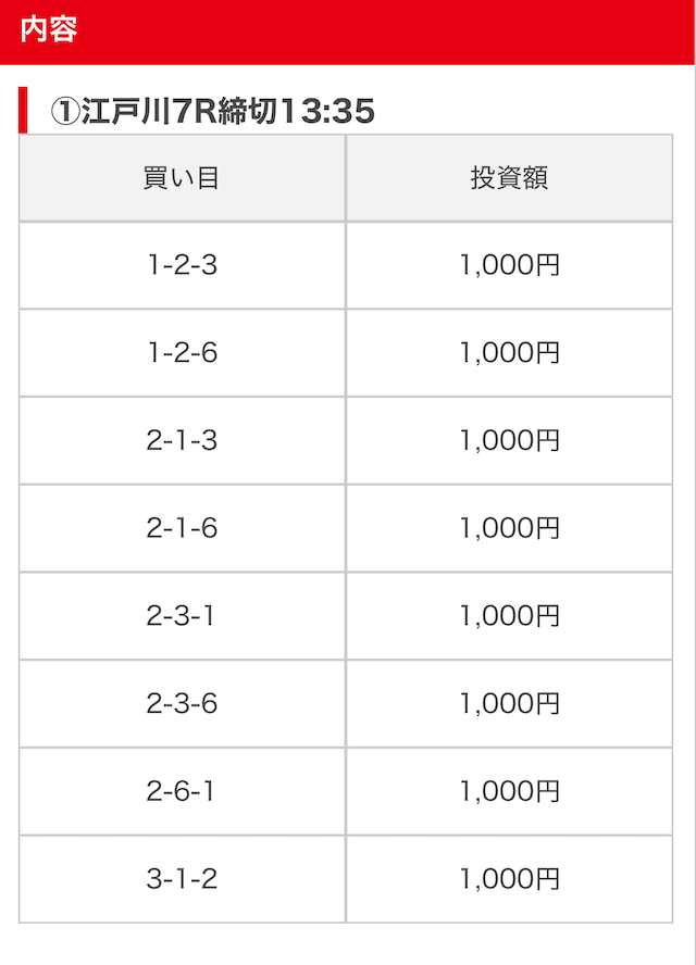 | 買い目 | オッズ | 購入金額 | 推定払戻 |