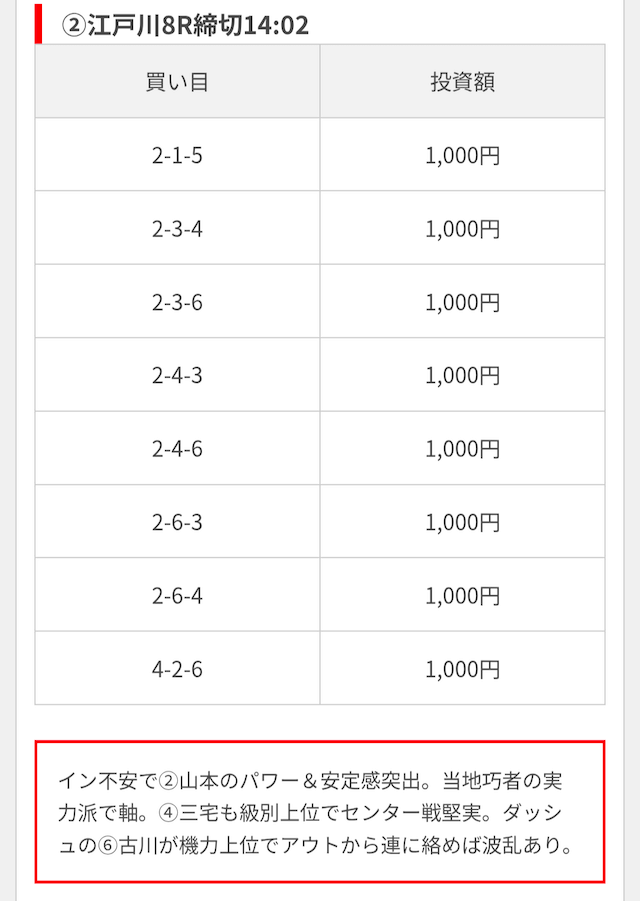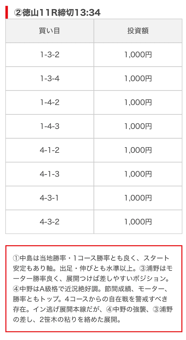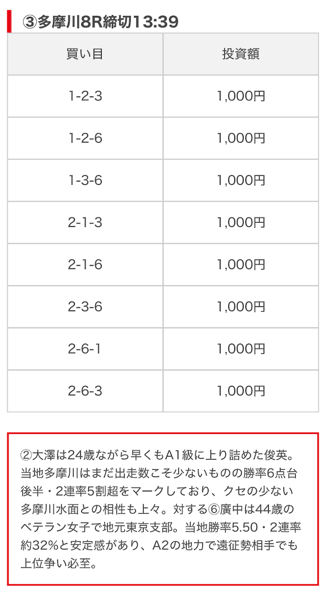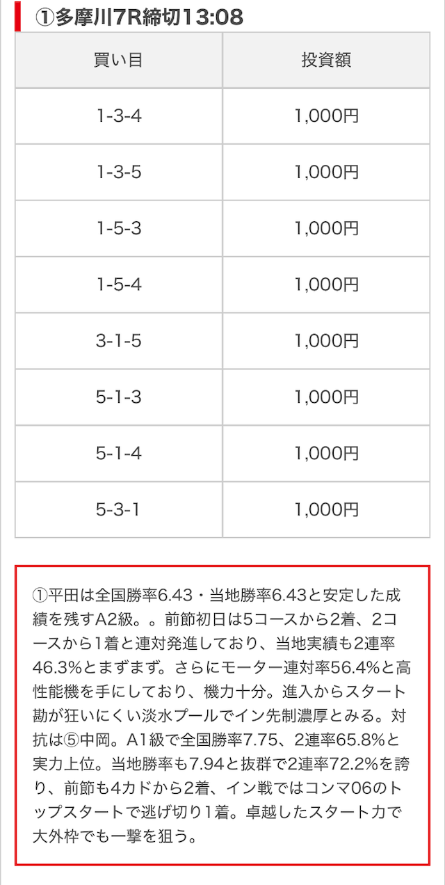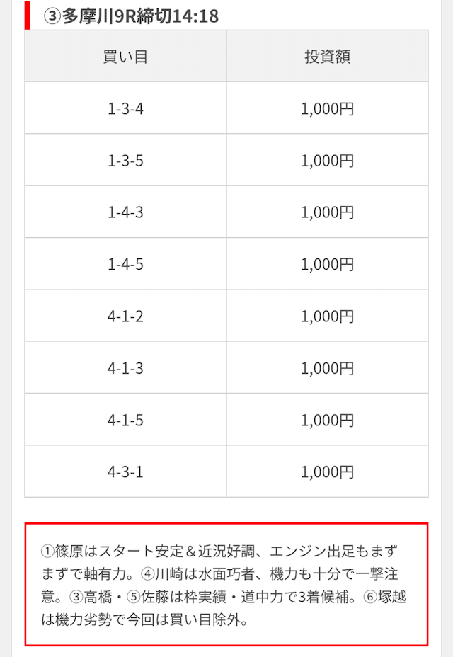相手についても同様の考え方をしているようで、当地勝率の低い③,⑤号艇の評価を下げた買い目です。