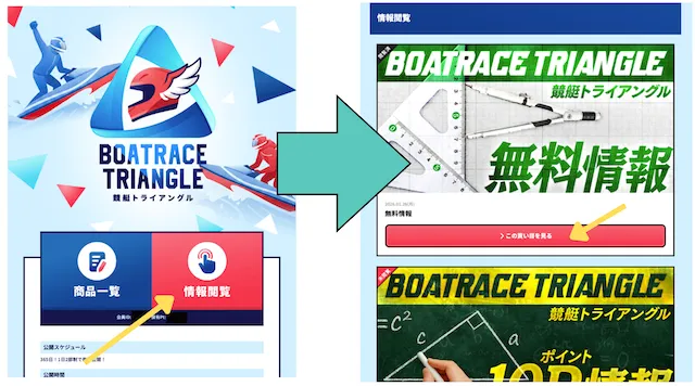 - Q3競艇トライアングルの無料予想はどこから見れる?A無料予想はサイトトップの閲覧情報から無料予想の公開ページに遷移することができます。また、無料予想が公開されるとLINEで通知が来るので、そのリンクからも閲覧可能です。