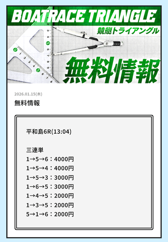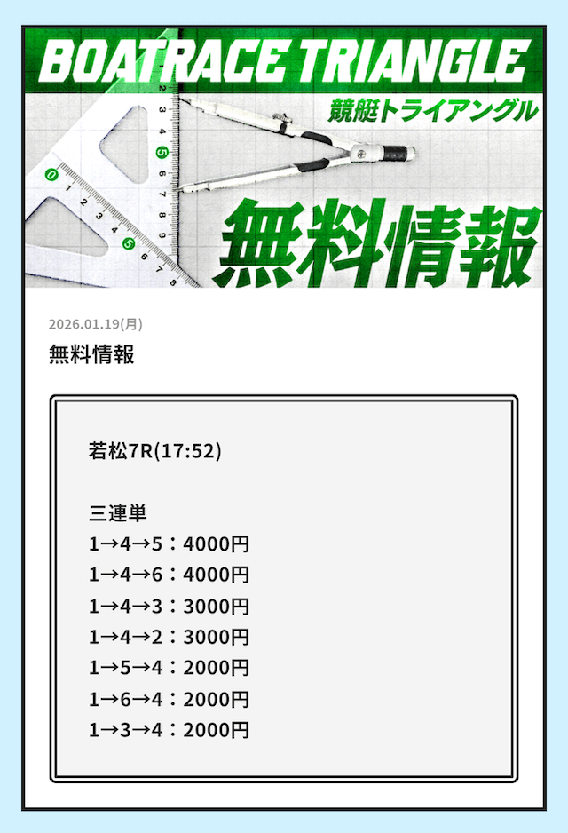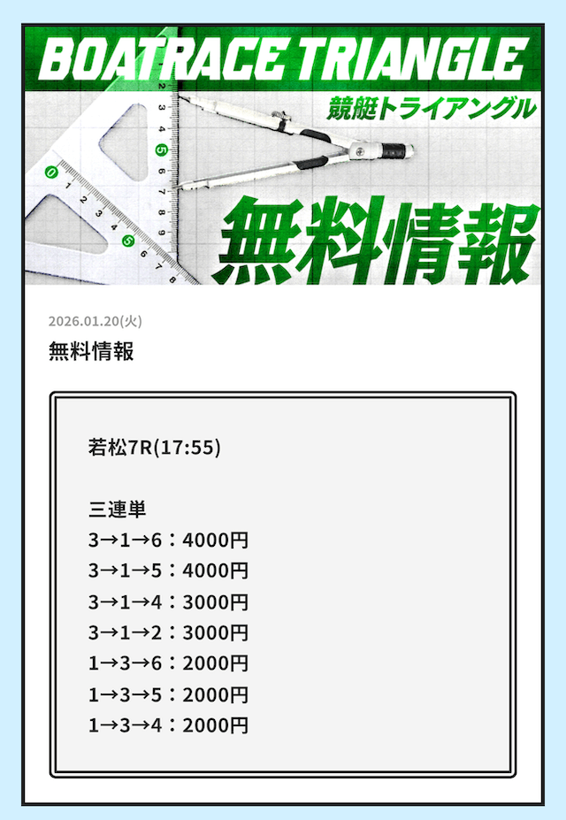 初検証で参加した2026年1月10日における競艇トライアングルの無料予想を確認すると以下のようになっています。