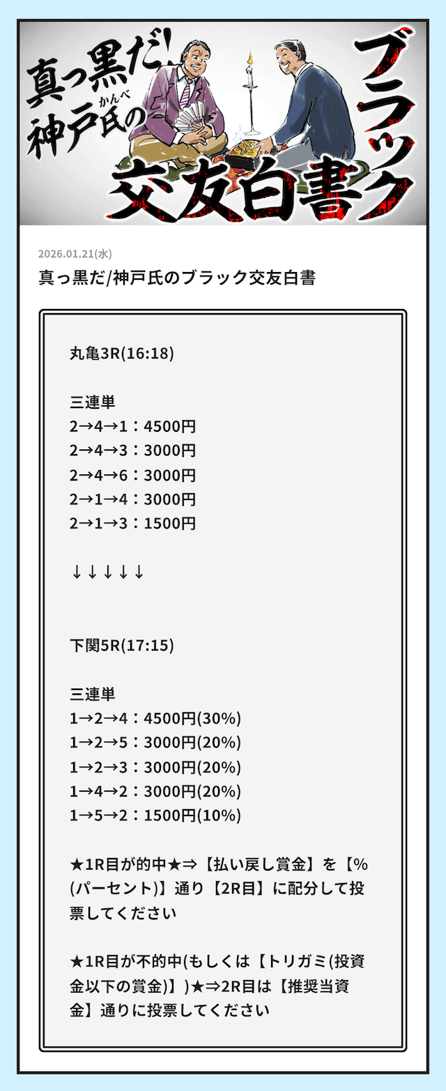 ★★★★★ 5.0 NEW2026/01/23うまみあるレースで勝負してくれるから払戻が想像以上です。 推奨の舟券代より少なくても稼げるので、かなり優秀だと思います。