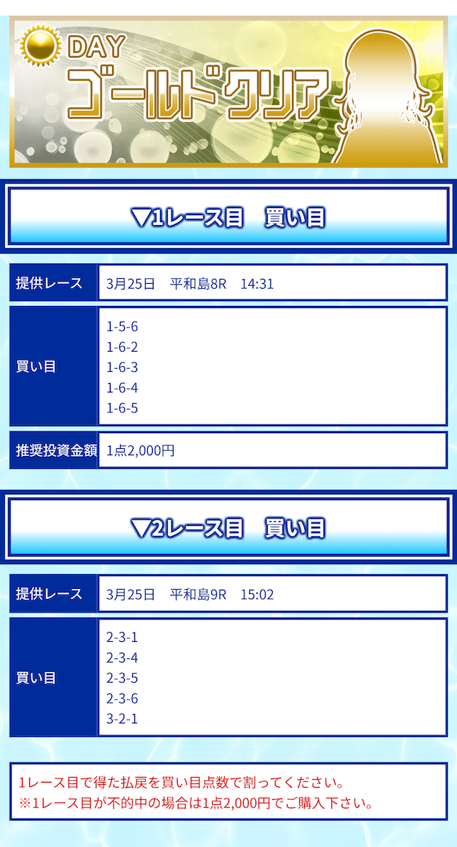 3月25日㈬のゴールドクリアを確認すると、ちょうど有料予想の検証で不的中になったレースが掲載されていました。