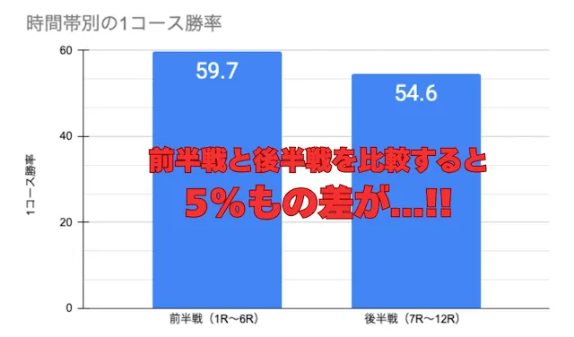 特に気温が低い朝の時間帯はモーターの出足が良くなるため、1コースの勝率はさらに上昇傾向にあります。