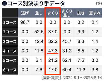 さらに、3~5コースのまくり・まくり差しの成功率が高い点も2コースの連対率の低さに起因しています。