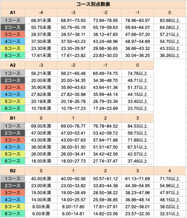 階級別(A1,A2,B1,B2)に各選手のコース別勝率を5段階評価。各コース別勝率の平均値を算出し、平均値に満たない場合は減点しています。