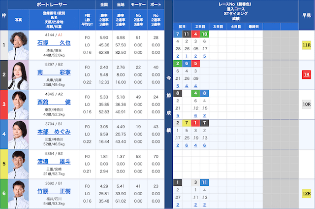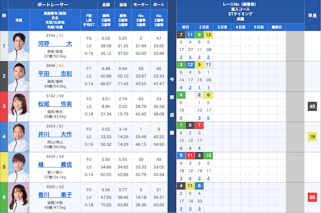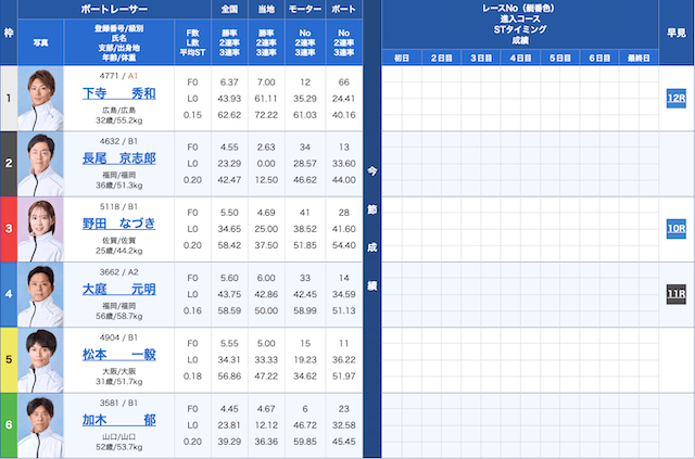 若松競艇は、海水の競艇場です。 海水は、淡水と比べて塩分濃度が高いので、浮力が大きくなります。 そのため、体重の重い選手は重心が安定して、小回りなターンを決めやすくなるので、体重を見て買い目を検討してみてもいいでしょう。 ただ、出走者の平均体重から+5kg以上重い選手は活躍しづらいということを意識して勝負してください。
