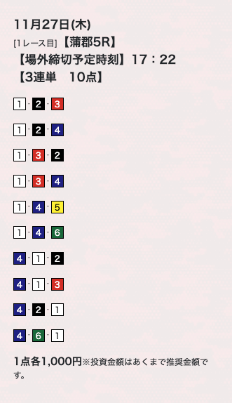 | チャレンジ(現地の予想屋) | 30戦18勝12敗 | +39,600円 |