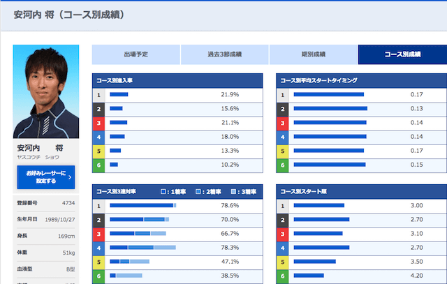 イン、アウト問わず果敢に攻めるので大穴を開けるレースも多く、4コースからの勝率・連対率は特に安定しています。