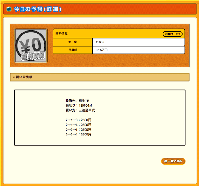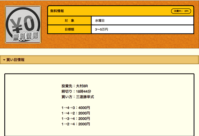 投資金額1万円に対し目標金額は3万円〜5万円なので、的中すると約2万円以上の利益が見込める予想が提供されます。