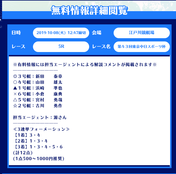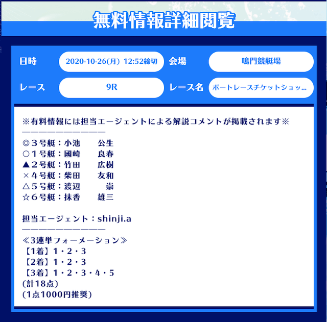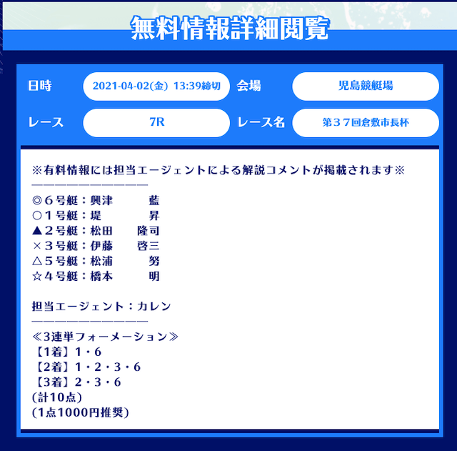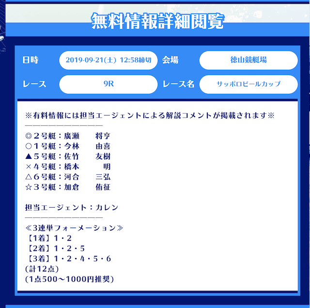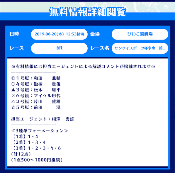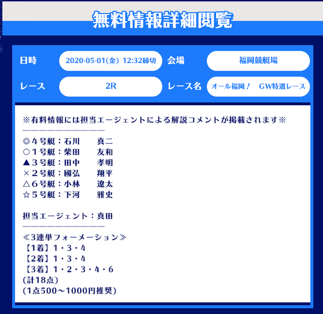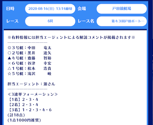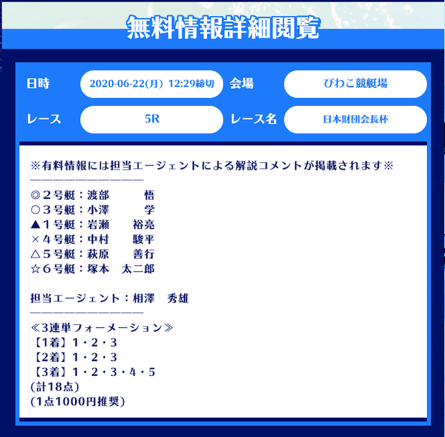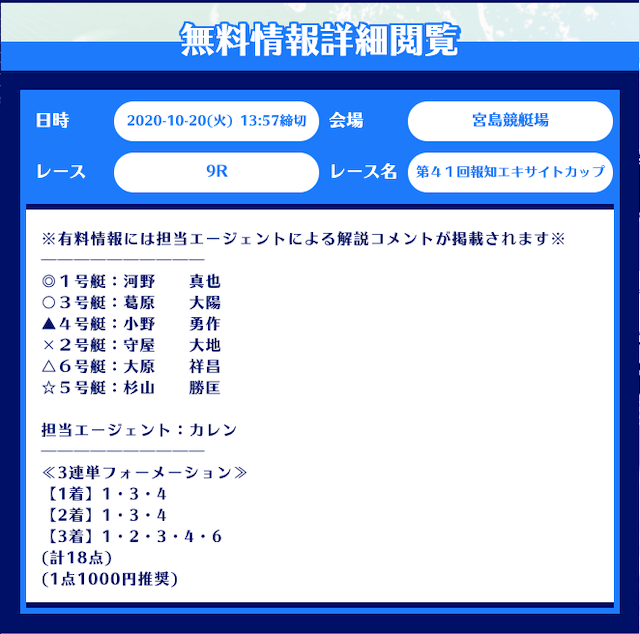 まず、舟生の無料予想はレース当日の12時前後に公開。