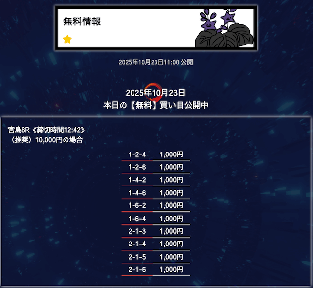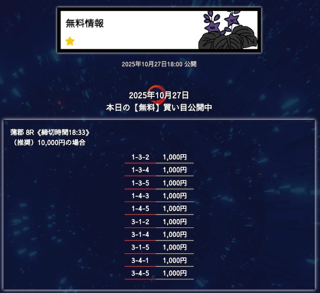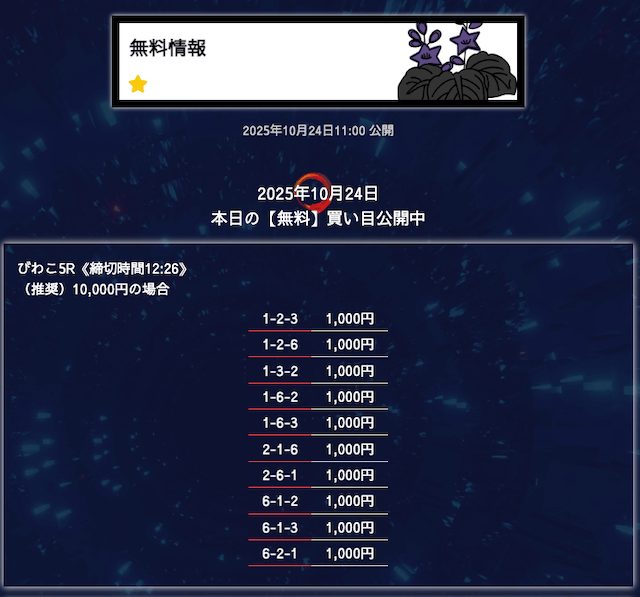 ’25/10/06 的中無料予想で28,300円の払い戻しを獲得