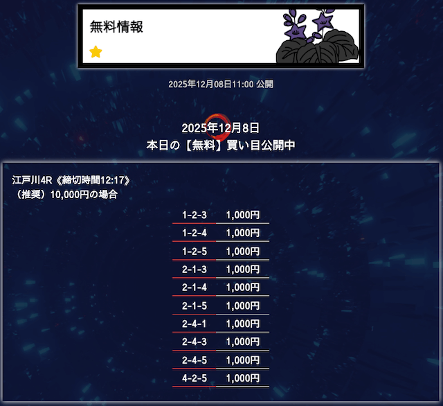 ’25/12/08 的中無料予想で56,100円の払い戻しを獲得