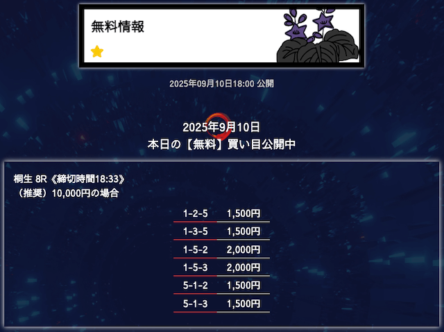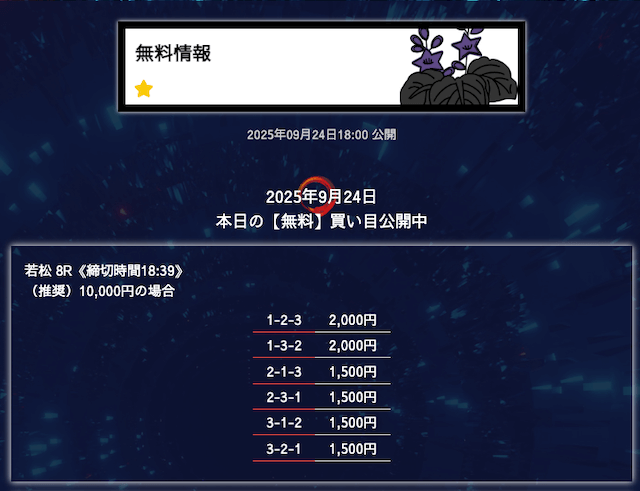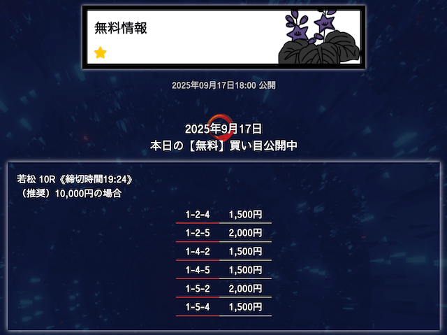 ’25/09/09 的中無料予想で15,300円の払い戻しを獲得