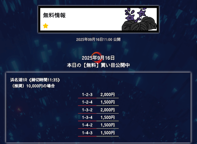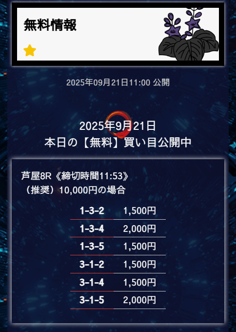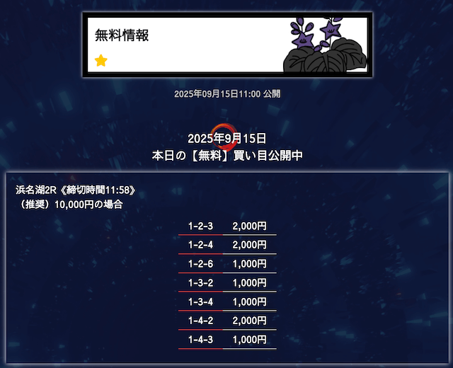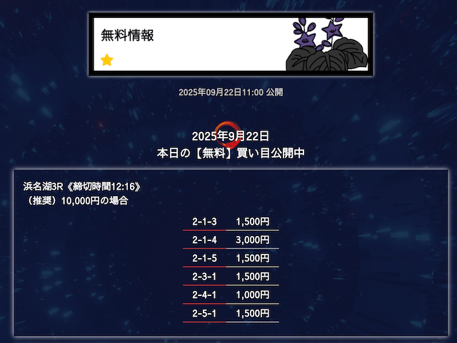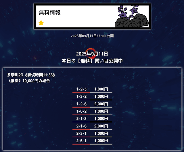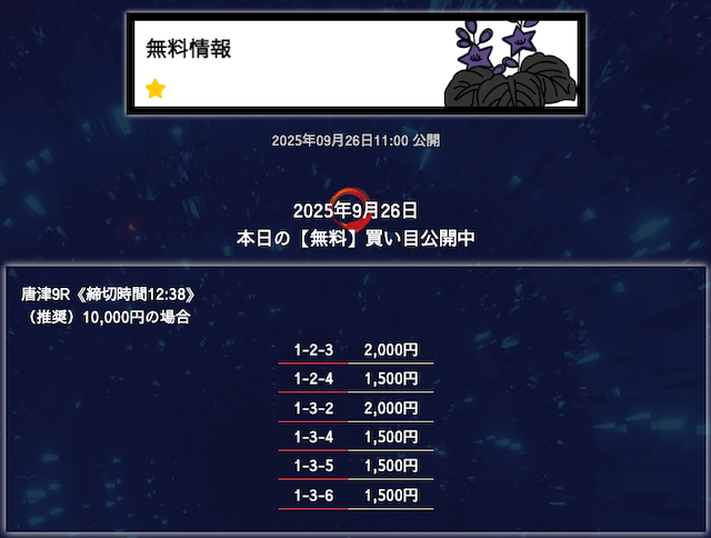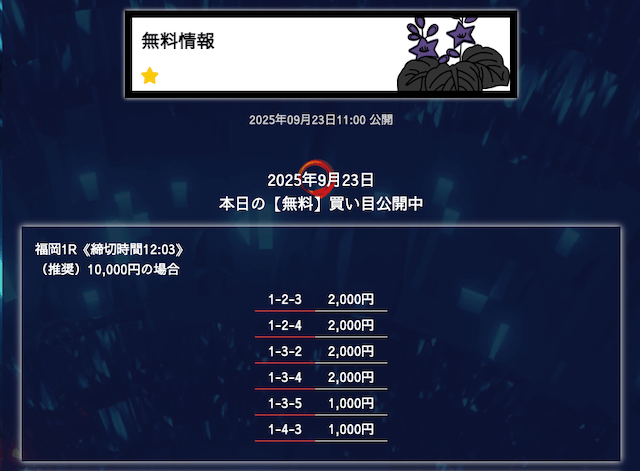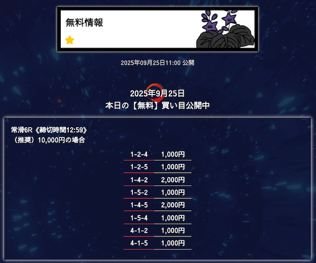 ’25/09/25 的中無料予想で11,600円の払い戻しを獲得