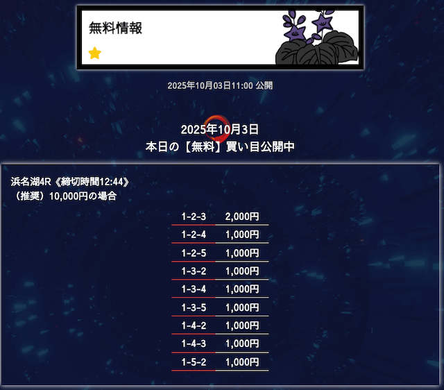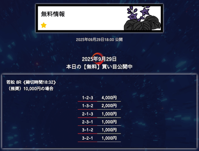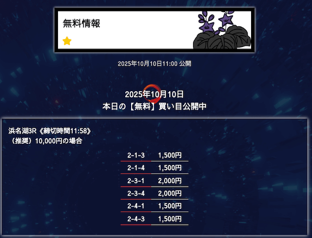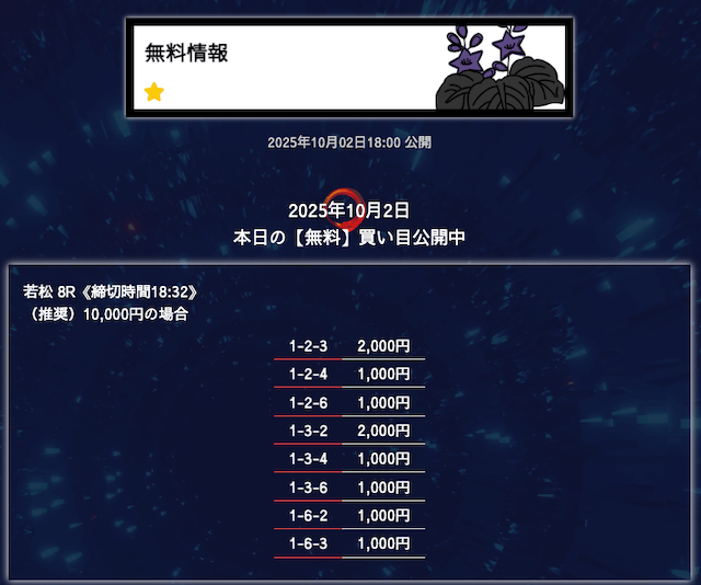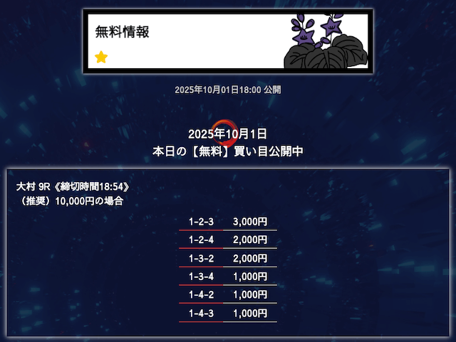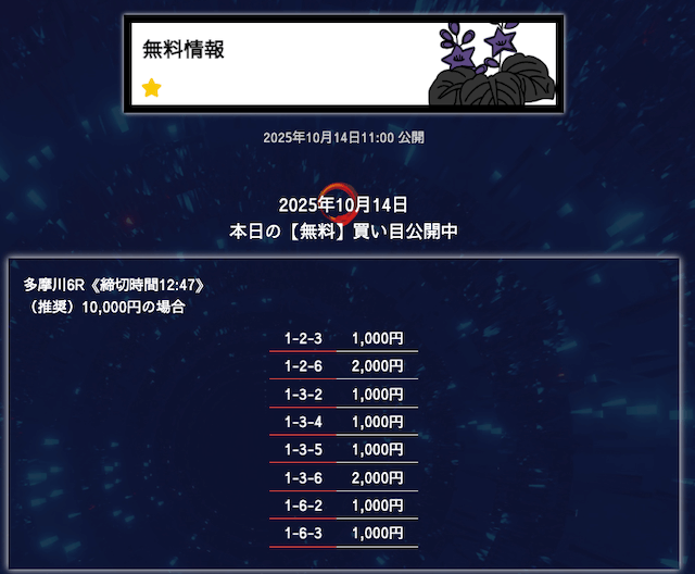 ’25/10/06 的中無料予想で28,300円の払い戻しを獲得