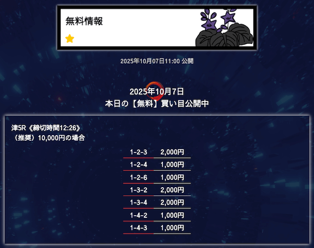 ’25/10/07 的中無料予想で11,800円の払い戻しを獲得