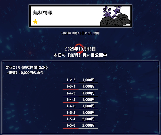 ’25/10/01 的中無料予想で11,400円の払い戻しを獲得