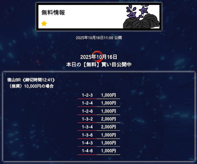 ’25/10/16 的中無料予想で10,200円の払い戻しを獲得