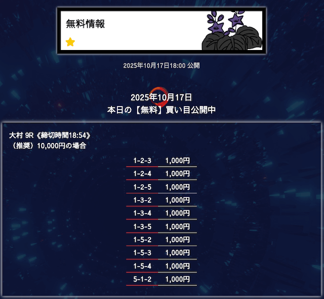 ’25/10/06 的中無料予想で28,300円の払い戻しを獲得