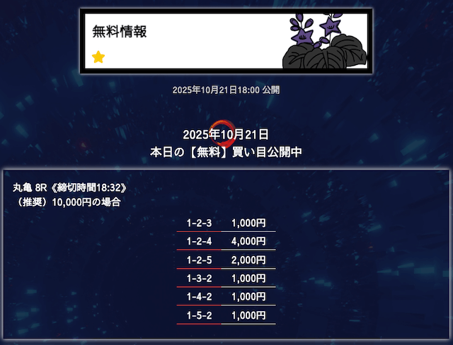’25/10/21 的中無料予想で19,500円の払い戻しを獲得