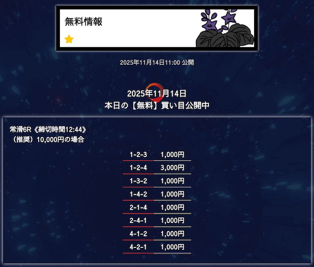 ’25/11/11 的中無料予想で13,400円の払い戻しを獲得