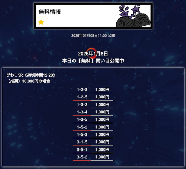 ’25/01/08 的中無料予想で29,700円の払い戻しを獲得